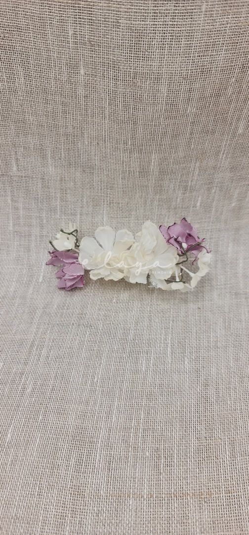 Tocado de flores con pinza. Colores blanco roto-Malva