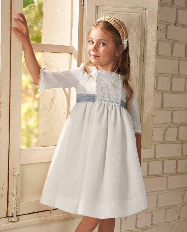 Vestido de ceremonia niña en tejido liso con mucho movimiento. Lleva el cuerpo bordado nido abeja hecho a mano en tonos azules.