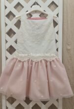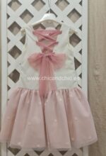 Vestido de ceremonia en beige sin mangas, falda de tul en rosa.