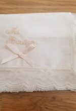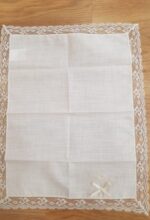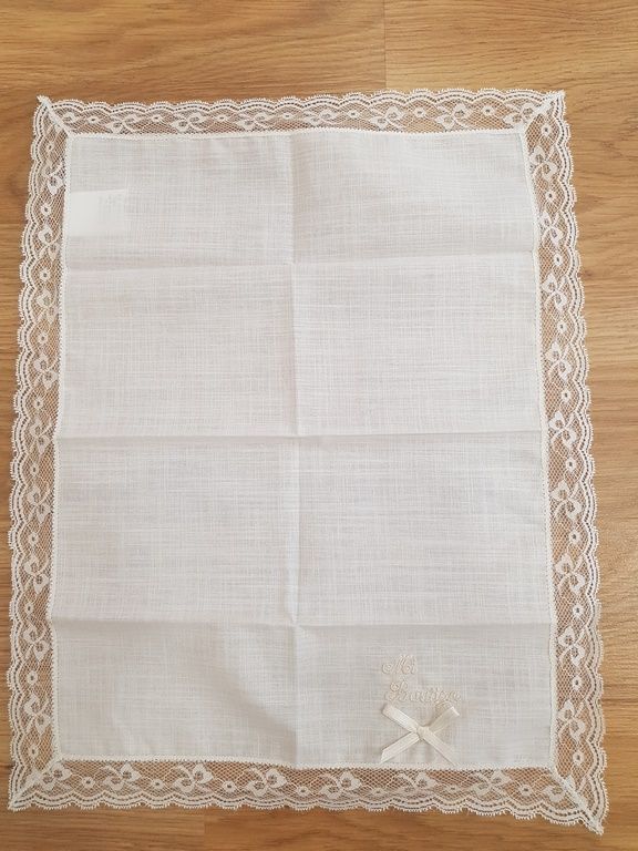 Pañuelo de bautizo en beige. Es rectangular de 34×43 cm y lleva todo el borde de puntilla de 3 cm.