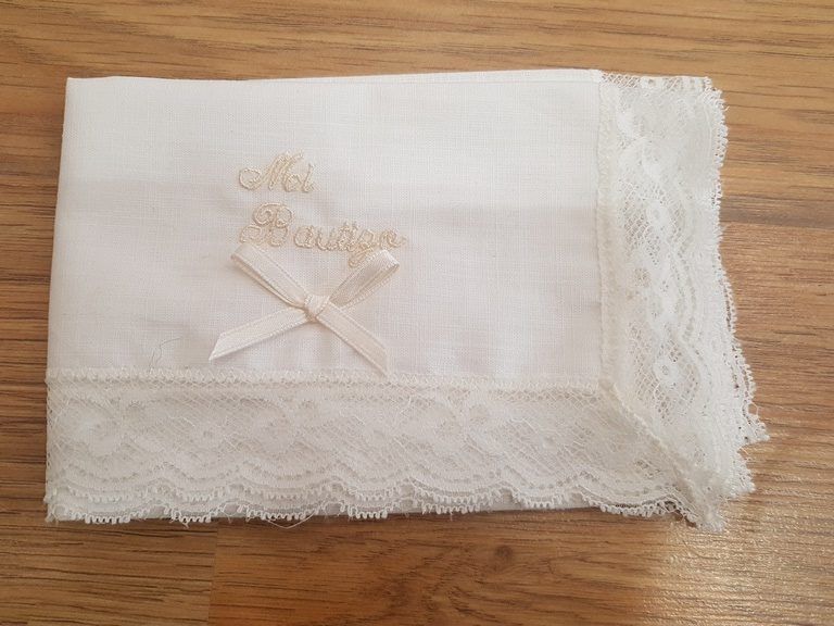 Pañuelo de bautizo en beige. Es cuadrado y lleva todo el borde de puntilla. Todo bordado beige. Si se quiere la palabra «Mi bautizo» en otro color, enviar email especificandolo.