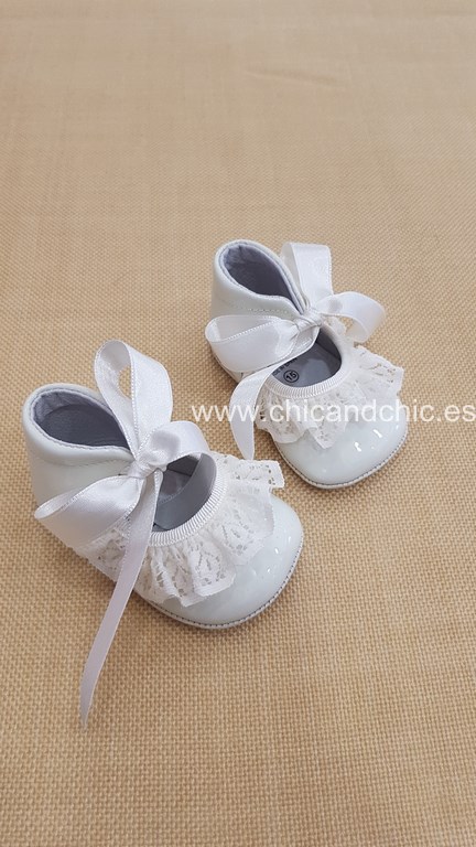 Zapato bebe en piel charol beige. Se ata con un lazo en raso beige. Es un zapato con suela blanda para bebés que no caminan. Ideales para cualquier ceremonia.
