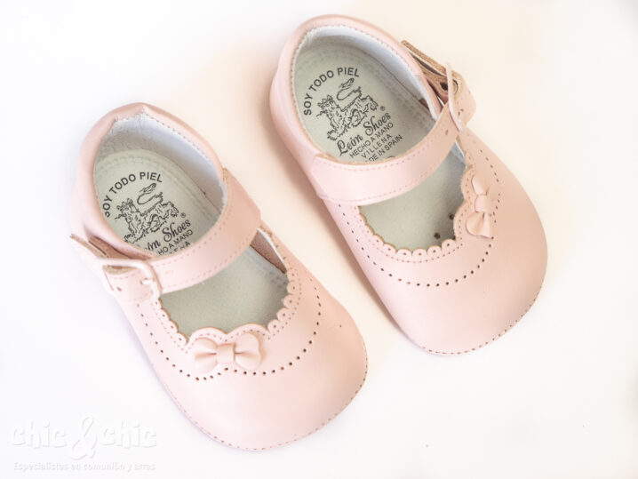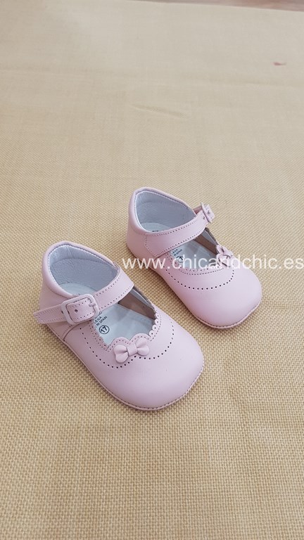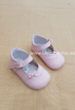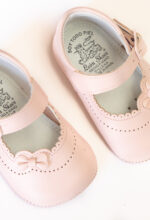 Zapato bebe en piel rosa. Es un zapato con suela blanda para bebés que no caminan. Ideales para cualquier ceremonia.
