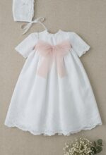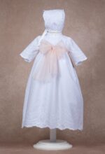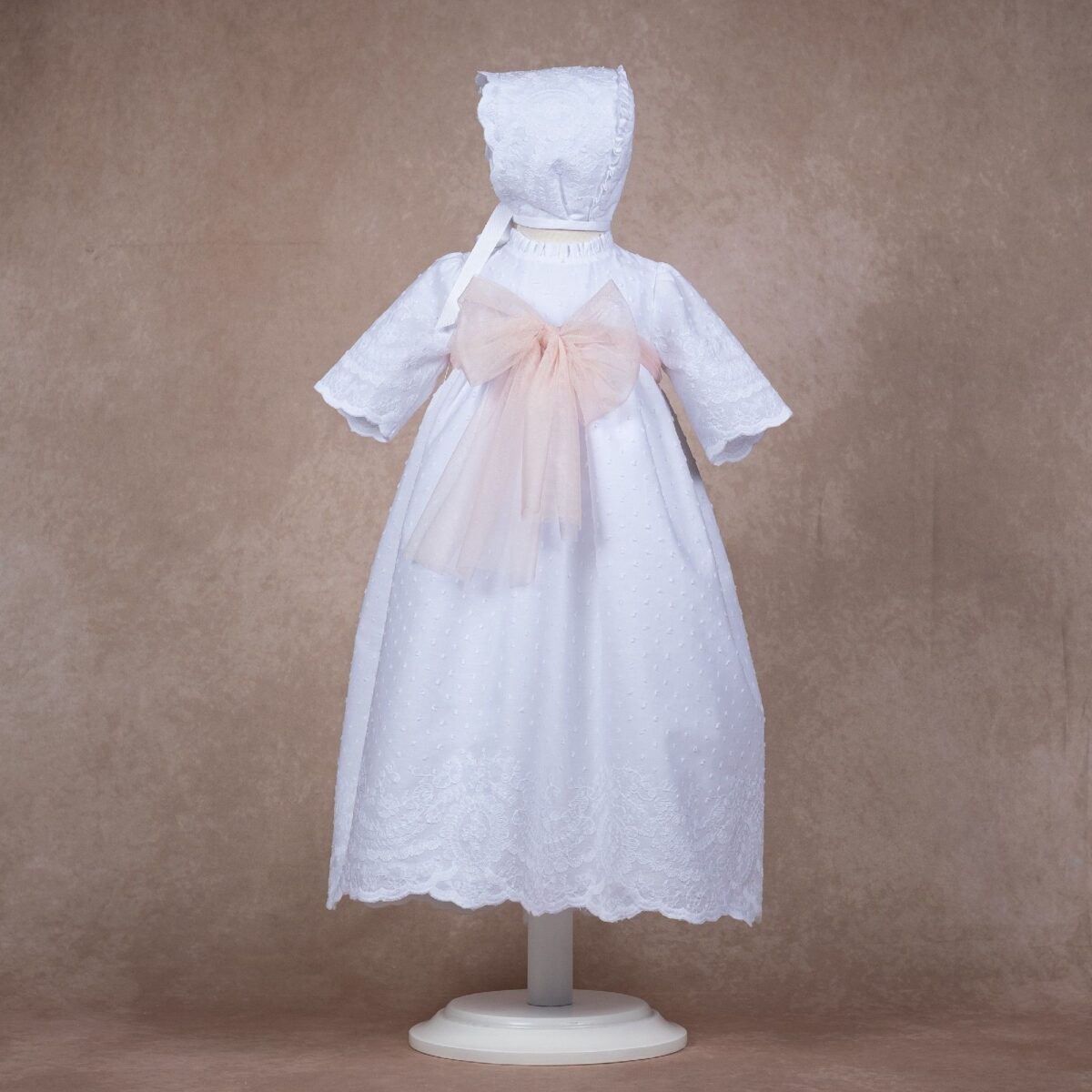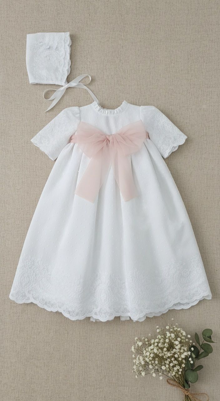 Faldón corto en plumeti bordada color blanco roto con capota. Lleva un fajín en tul rosa suave.