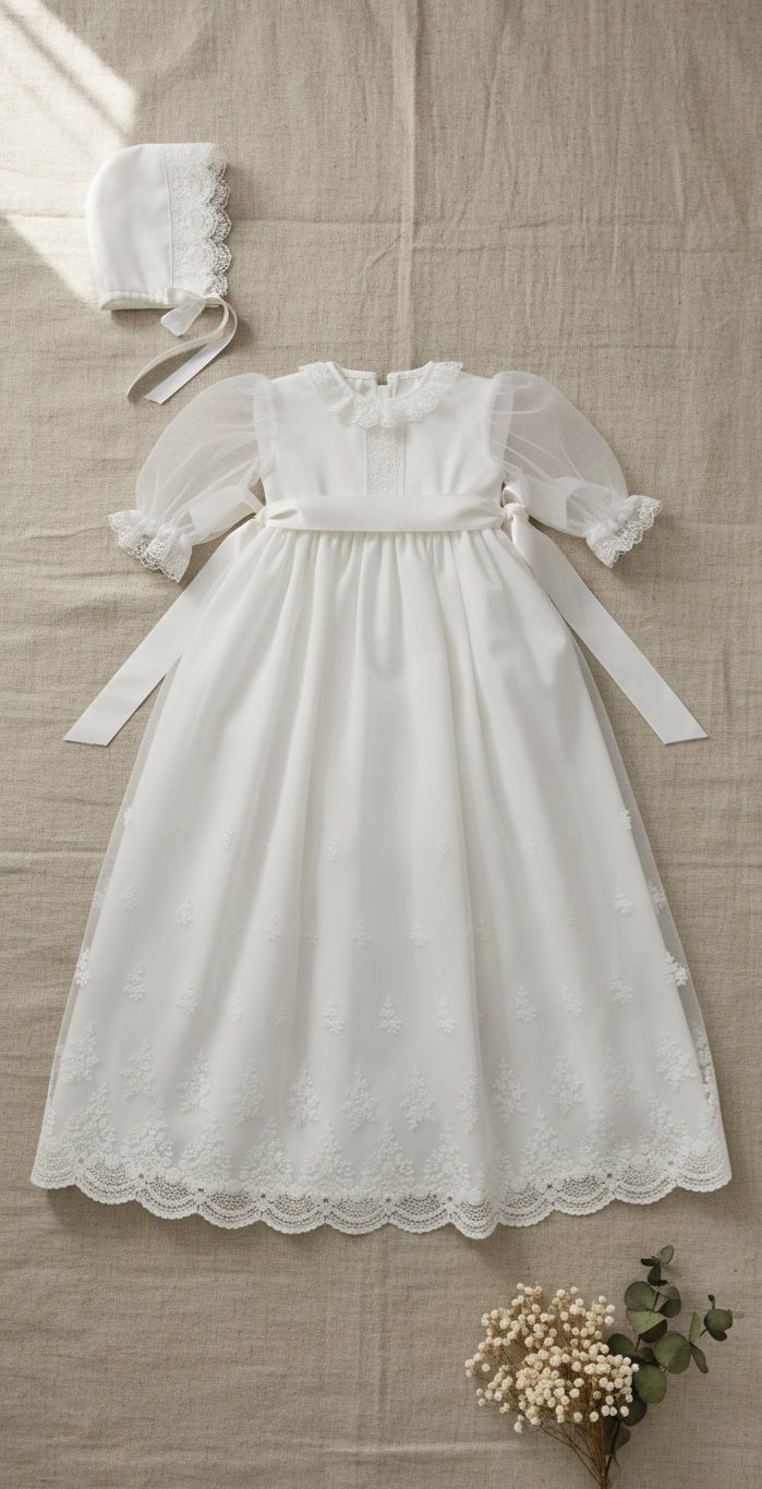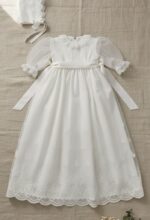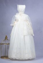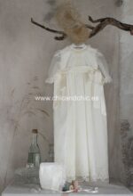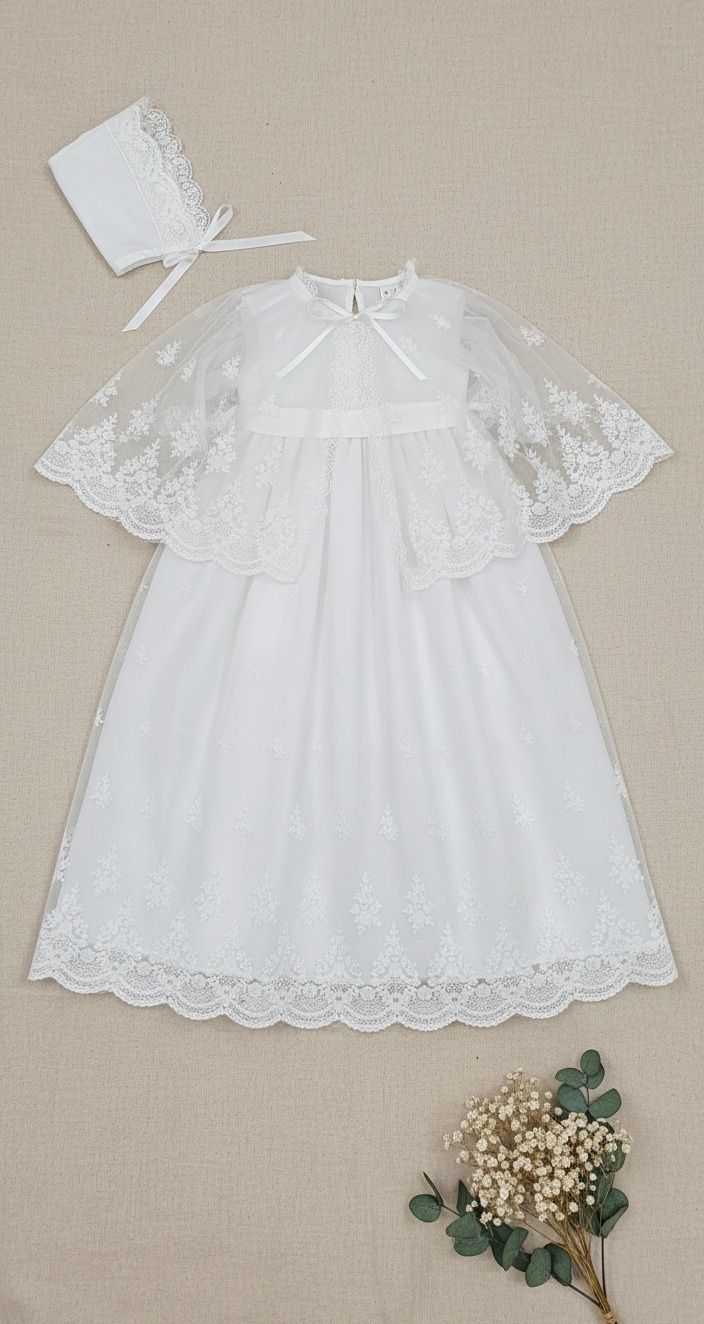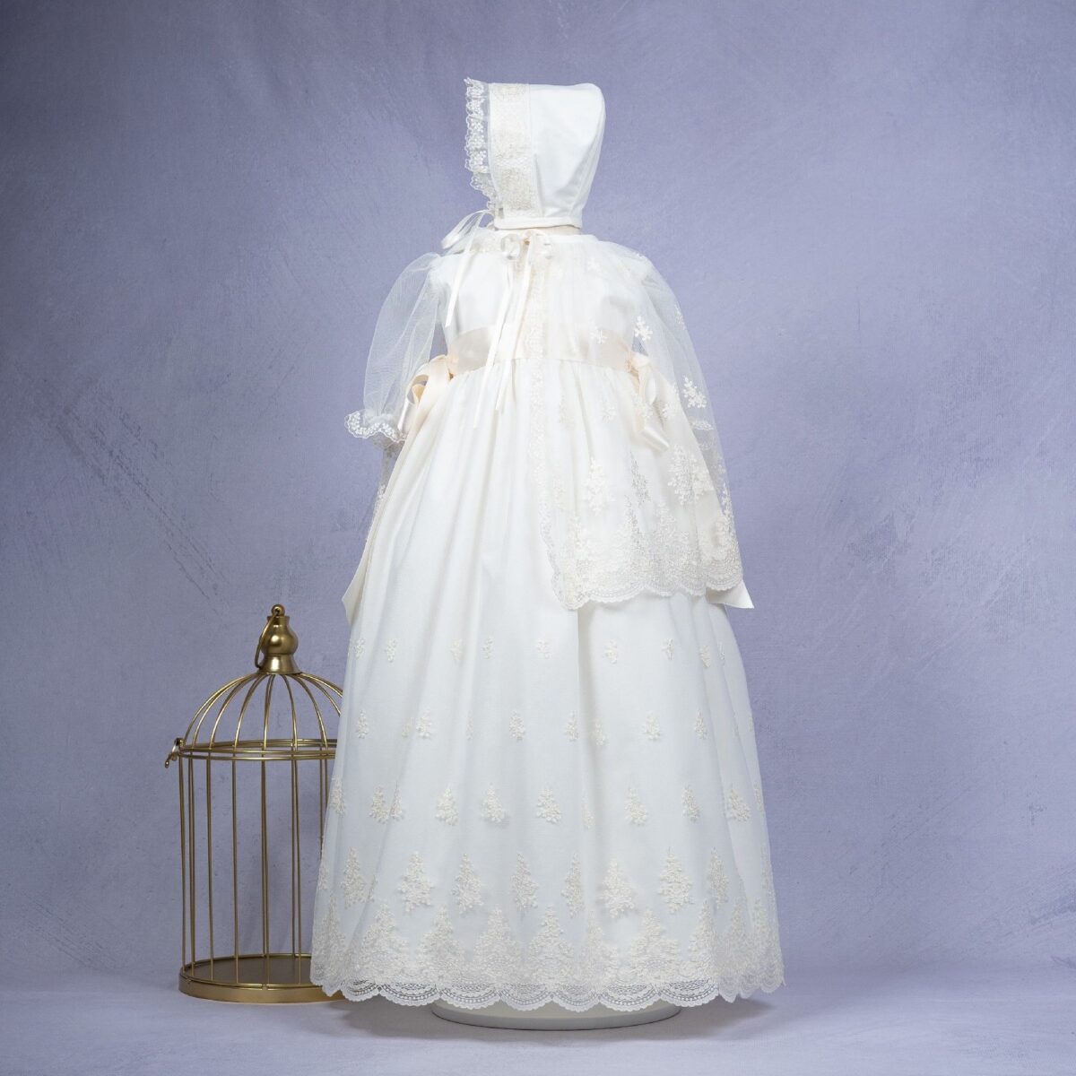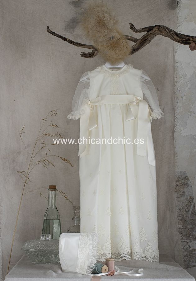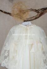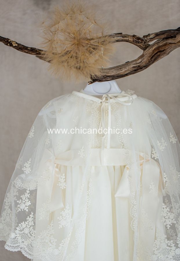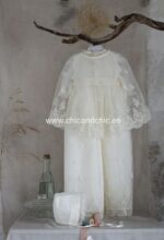 Faldón largo con capa para cristianar. Es de tul bordado. El cuerpo es liso, con encaje verticale, y lleva la manga transparente. La falda es larga, con tul bordado. Además lleva una capa y capota a juego. Por detrás, va abotonado, y debajo del faldón lleva un cuerpo sin mangas de algodón.