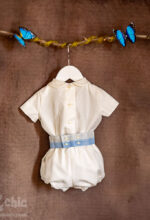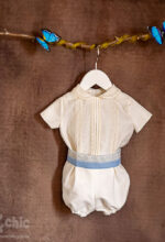 Conjunto de niño en lino en manga corta. La camisa es de cuello bebe y el pantalón es bombacho con goma Lleva un fajín en tono celeste decorado con un tul.