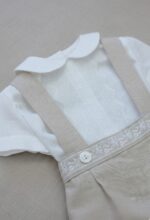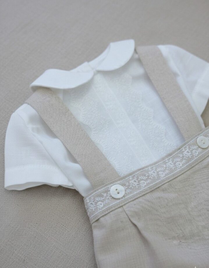 Conjunto de ceremonia en tipo lino, con detalles en tonos tostados. Destaca por su pechera con detalles de encaje que aportan un aire romántico y tradicional