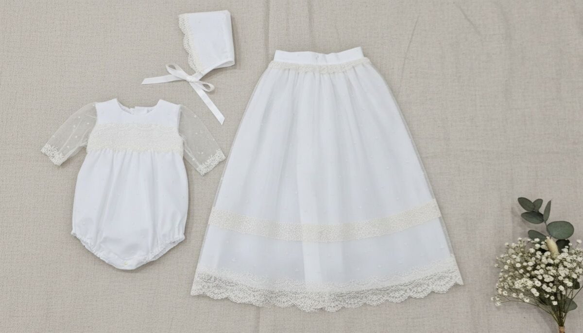 Conjunto ranita y faldón cristianar con una precioso tul bordado tono beige con capota, Perfecto para que se pueda quitar el faldon y quedarse despues de la ceremonia solo con la ranita.