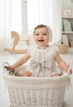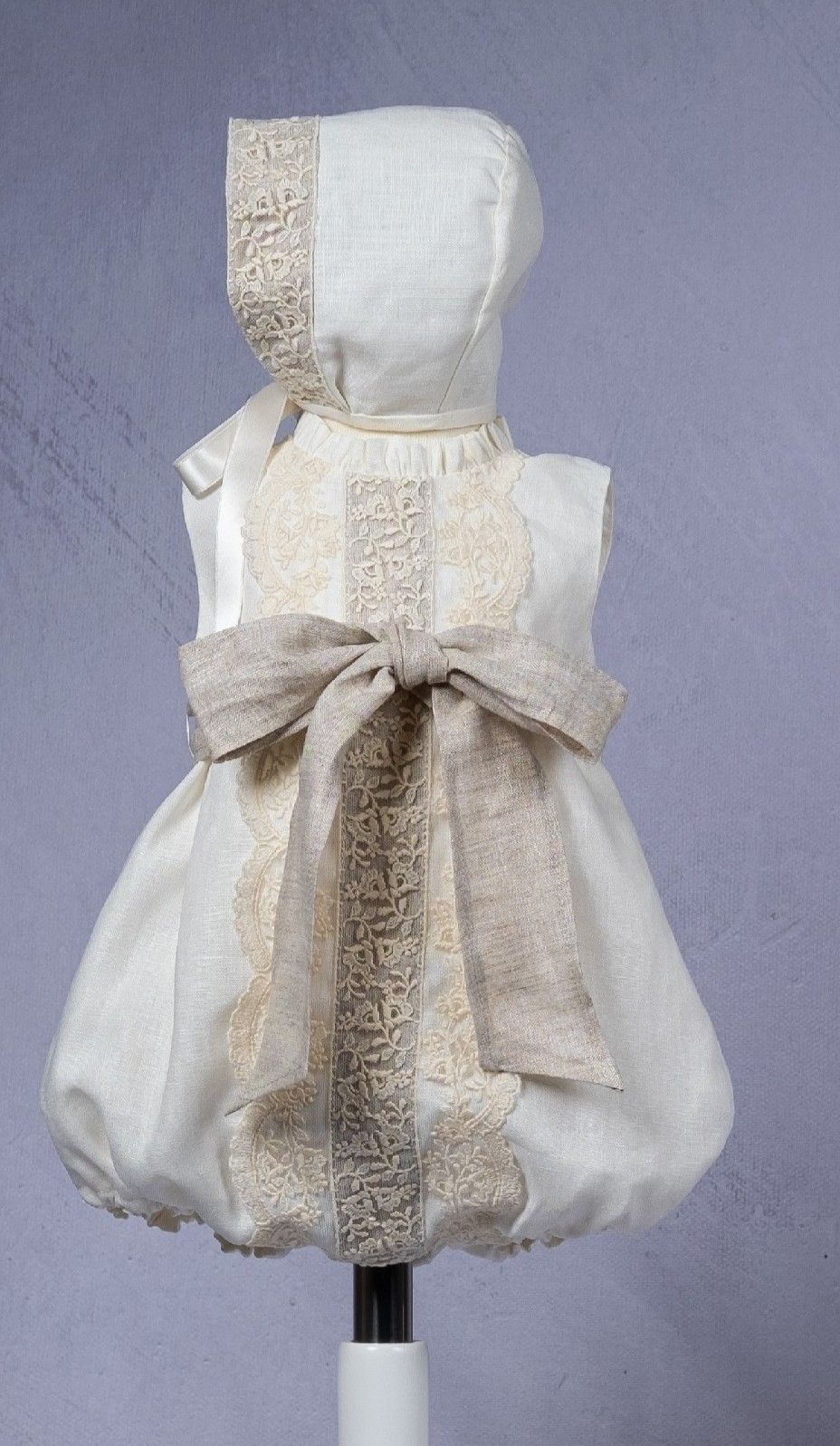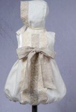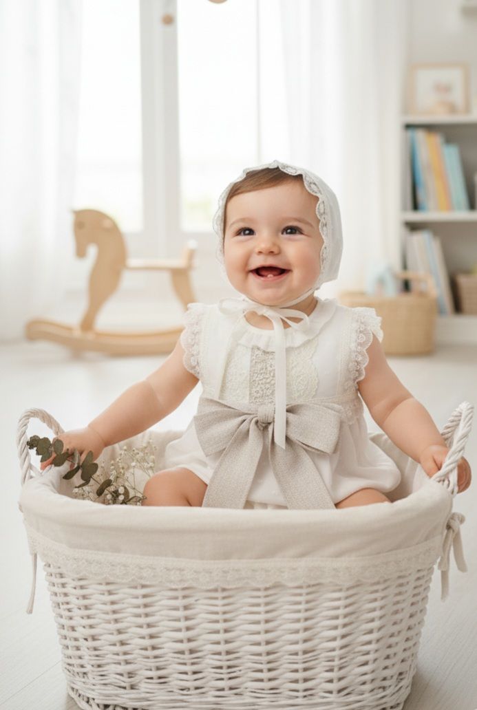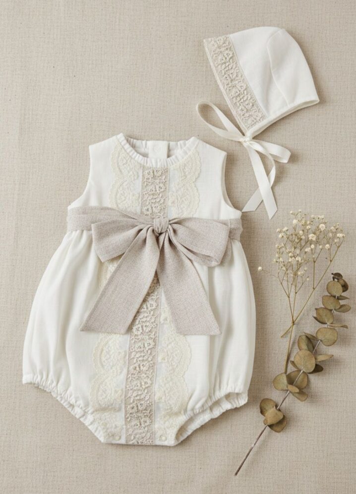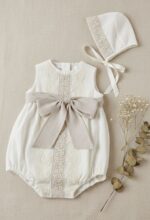 Pelele lino color marfil. con fajín y detalles en tostado.