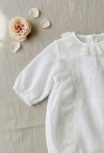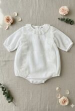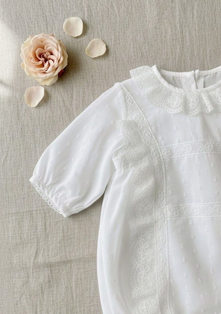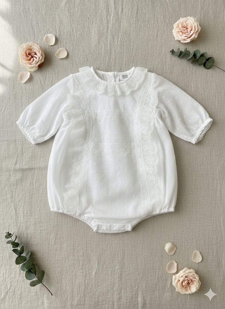 Pelele de bautizo en tono blanco roto en plumeti de algodón. Dulce pelele decorado con bonitas puntillas.