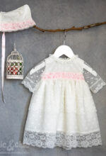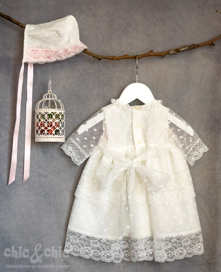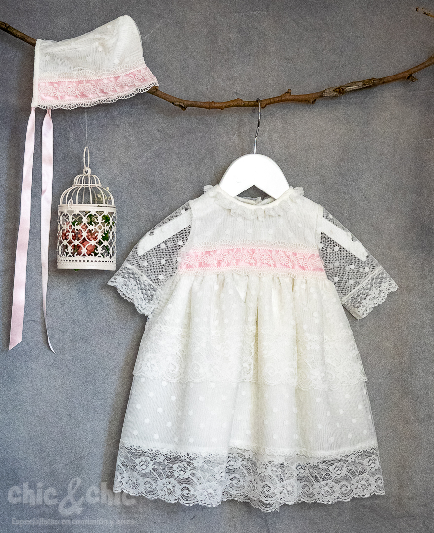 Vestido de ceremonia en tul de plumeti. Todo en color blanco roto y en la cintura lleva un cinturon en color rosa. Es de manga francesa en tul. Lleva una bonita puntilla tanto en la falda, como en el remate de la manga .