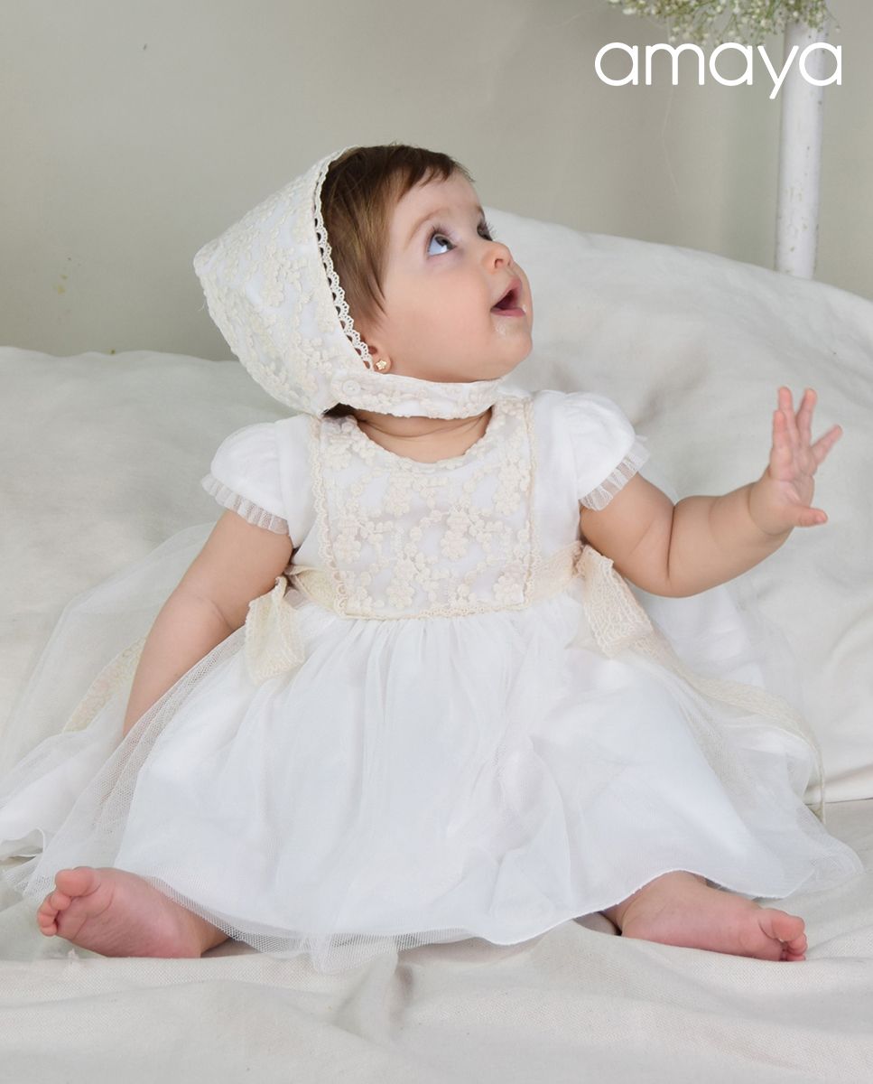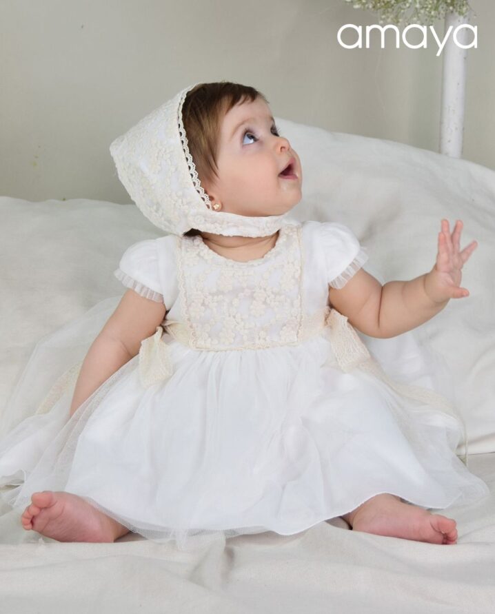 Vestido de ceremonia manga corta en tul. El cuerpo lleva tul bordado flores en tono beige.