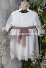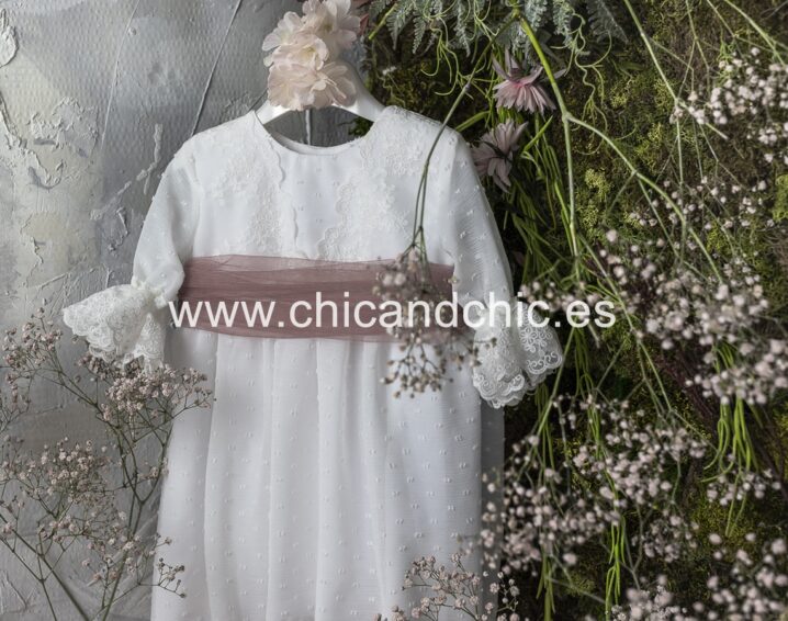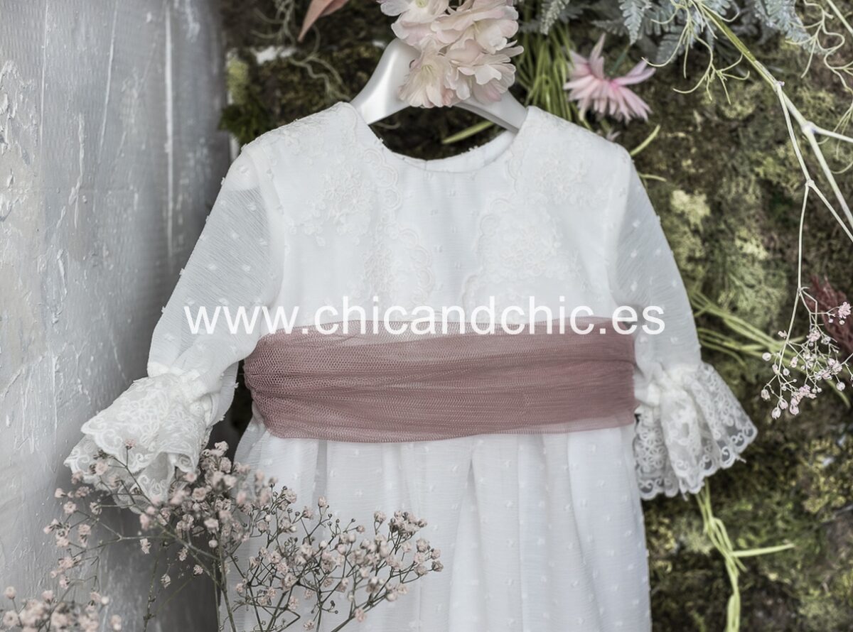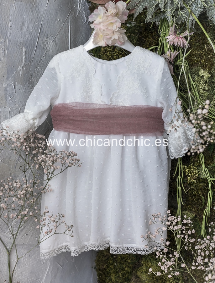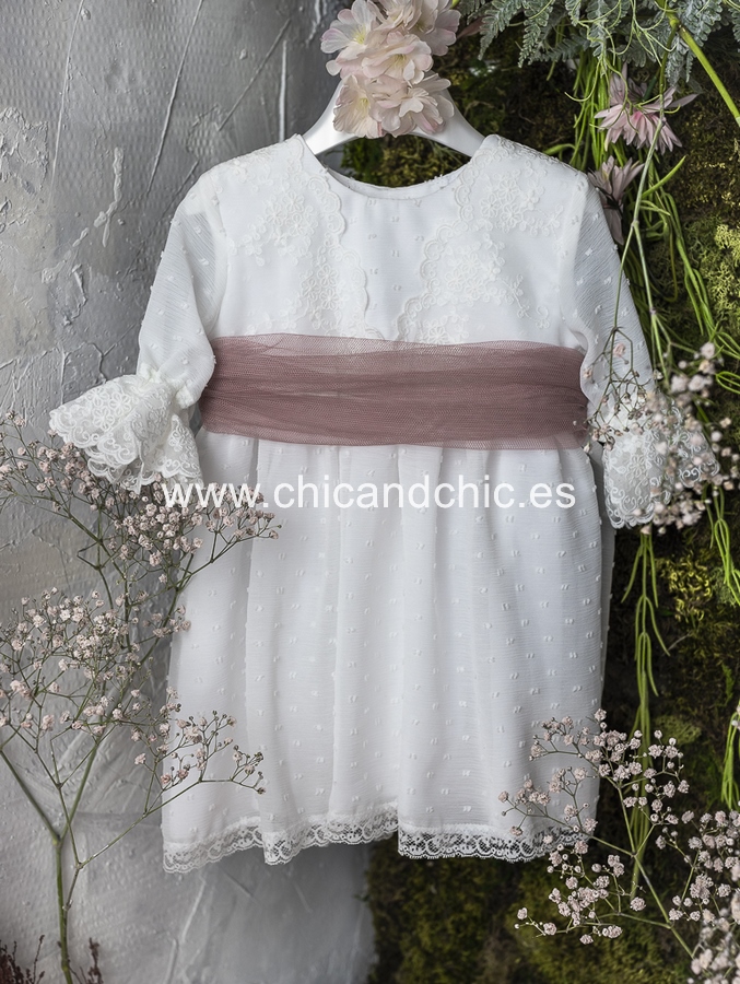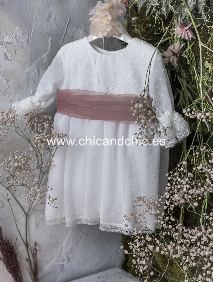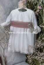 Vestido de ceremonia manga francesa en bambula plumeti, con puntilla en manga, cuerpo y falda. El fajín es tul rosa, pero se puede personalizar color.