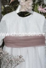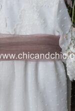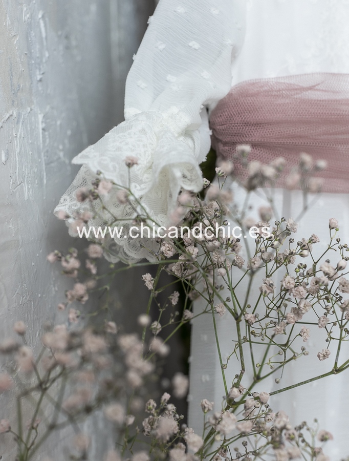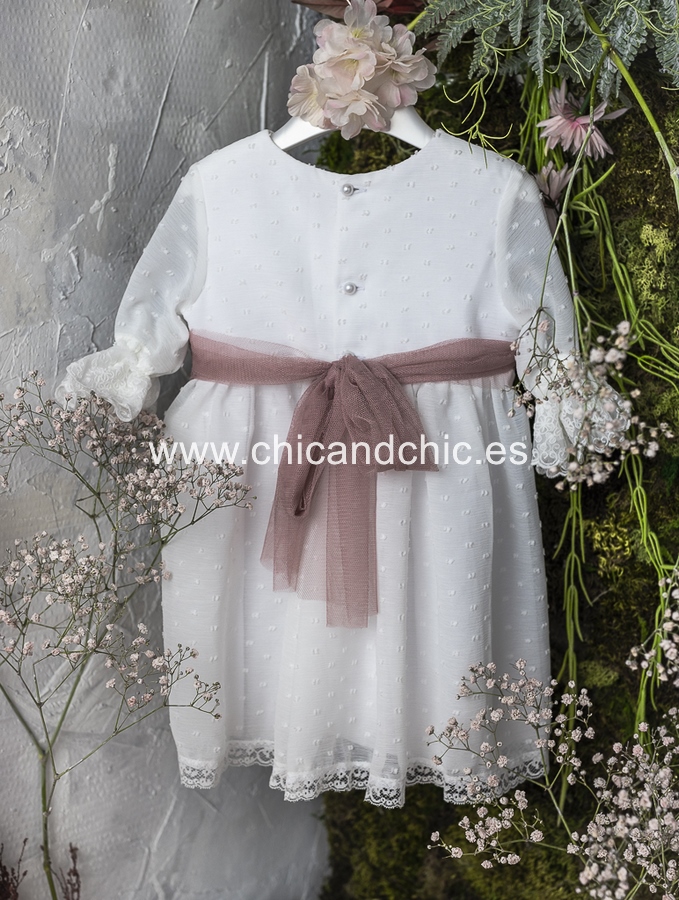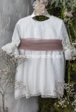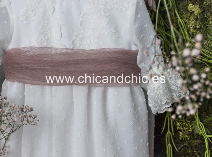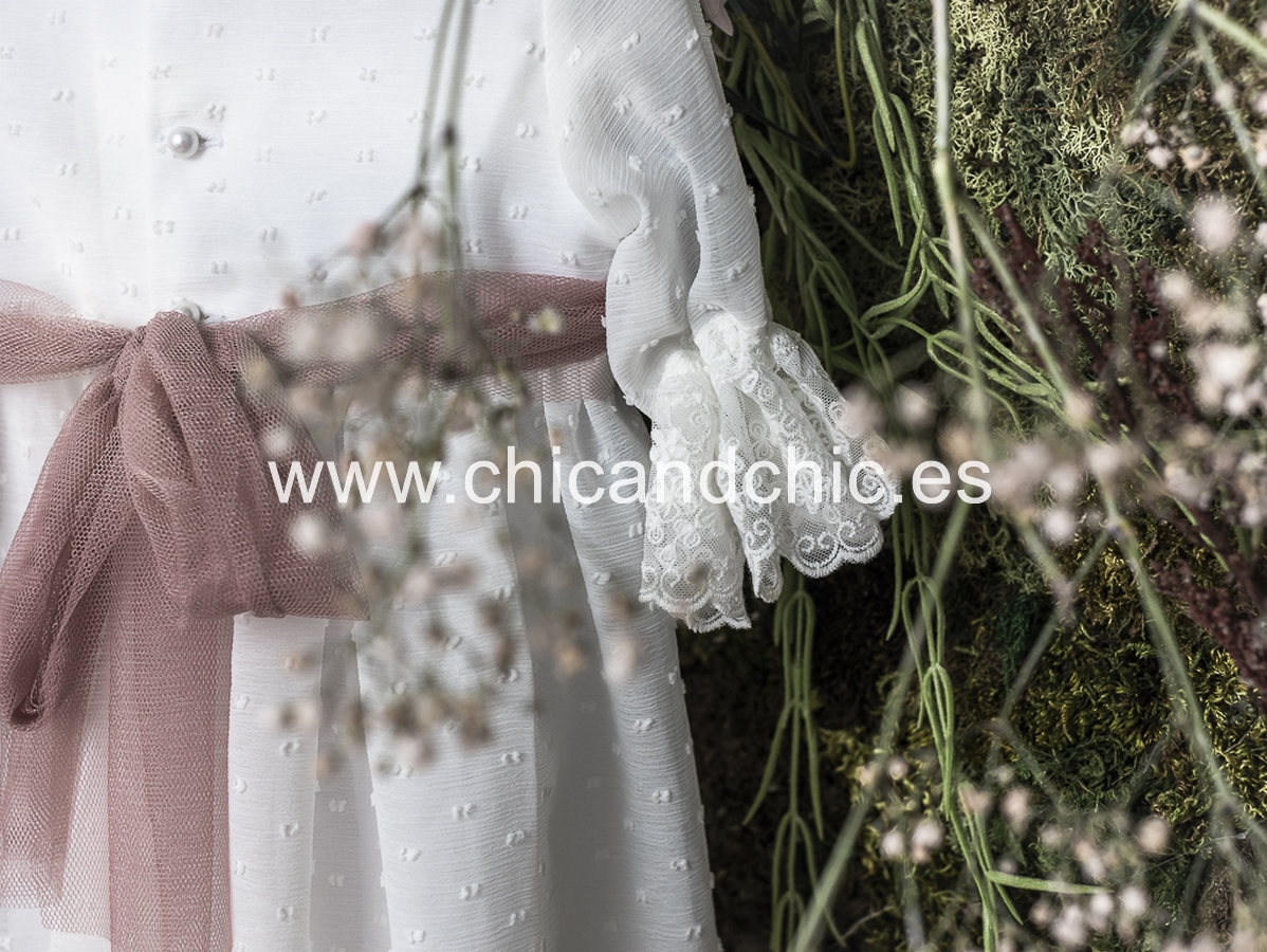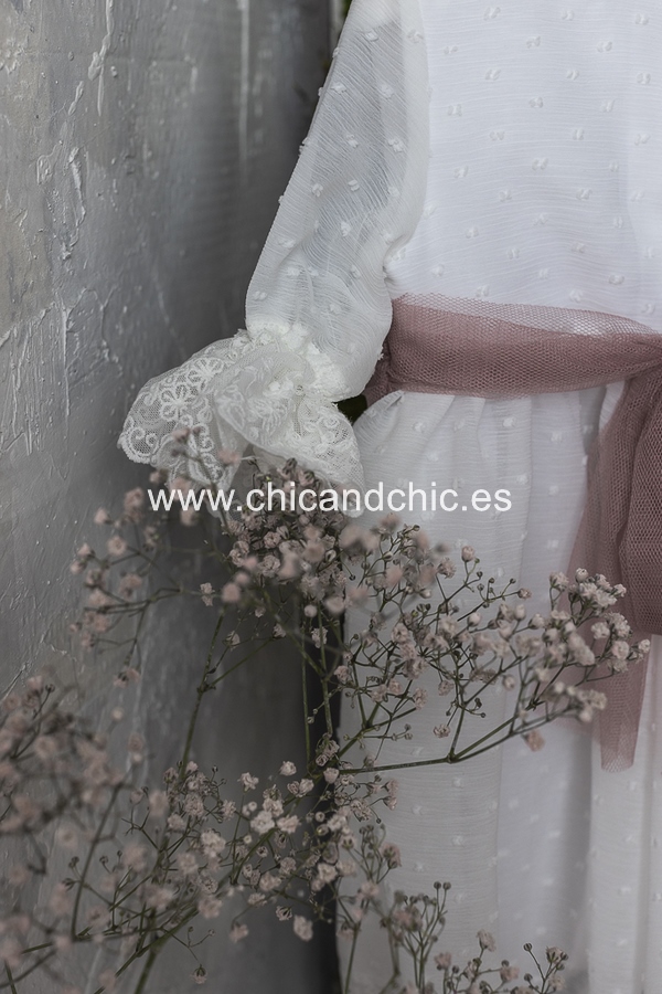 Vestido de ceremonia manga francesa en bambula plumeti, con puntilla en manga, cuerpo y falda. El fajín es tul rosa, pero se puede personalizar color.