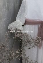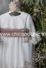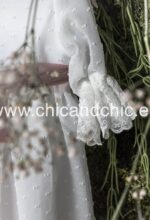 Vestido de ceremonia manga francesa en bambula plumeti, con puntilla en manga, cuerpo y falda.