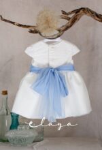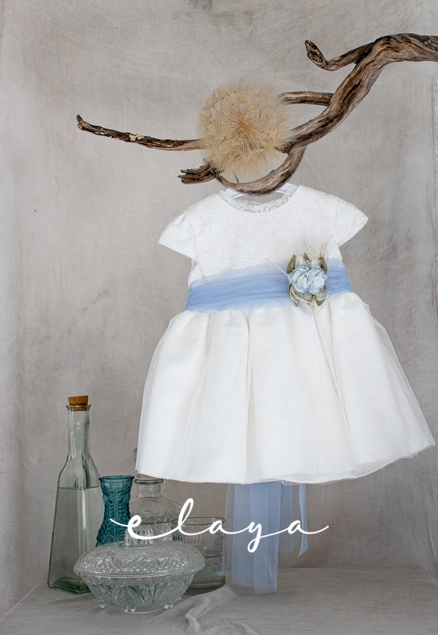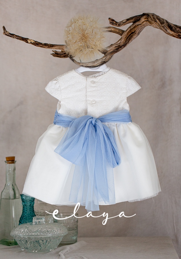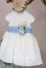 Vestido de ceremonia de manga corta con el cuerpo en voile bordado en color blanco roto, y la falda es de tul liso en el mismo tono.