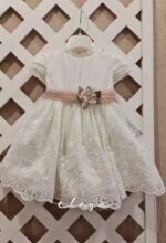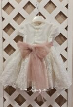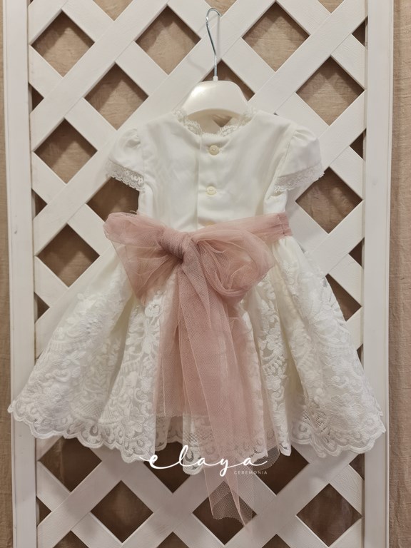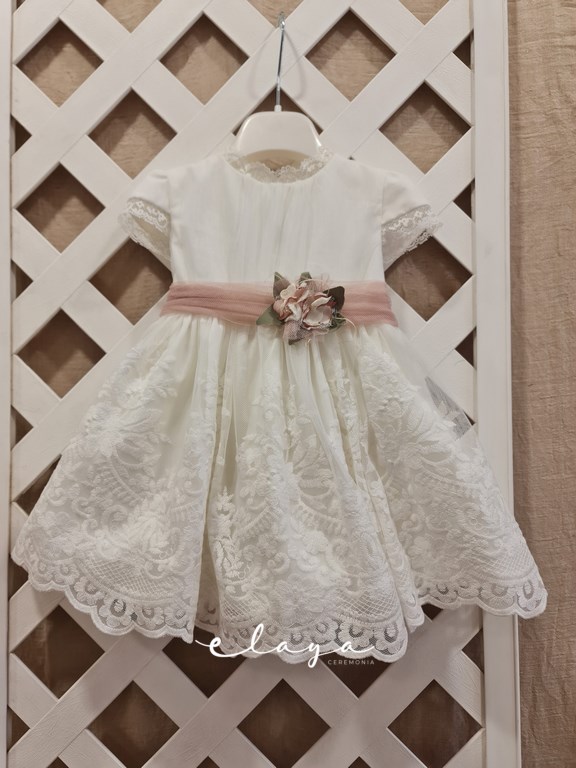 Vestido de ceremonia manga corta con un bonito tul bordado en blanco roto.