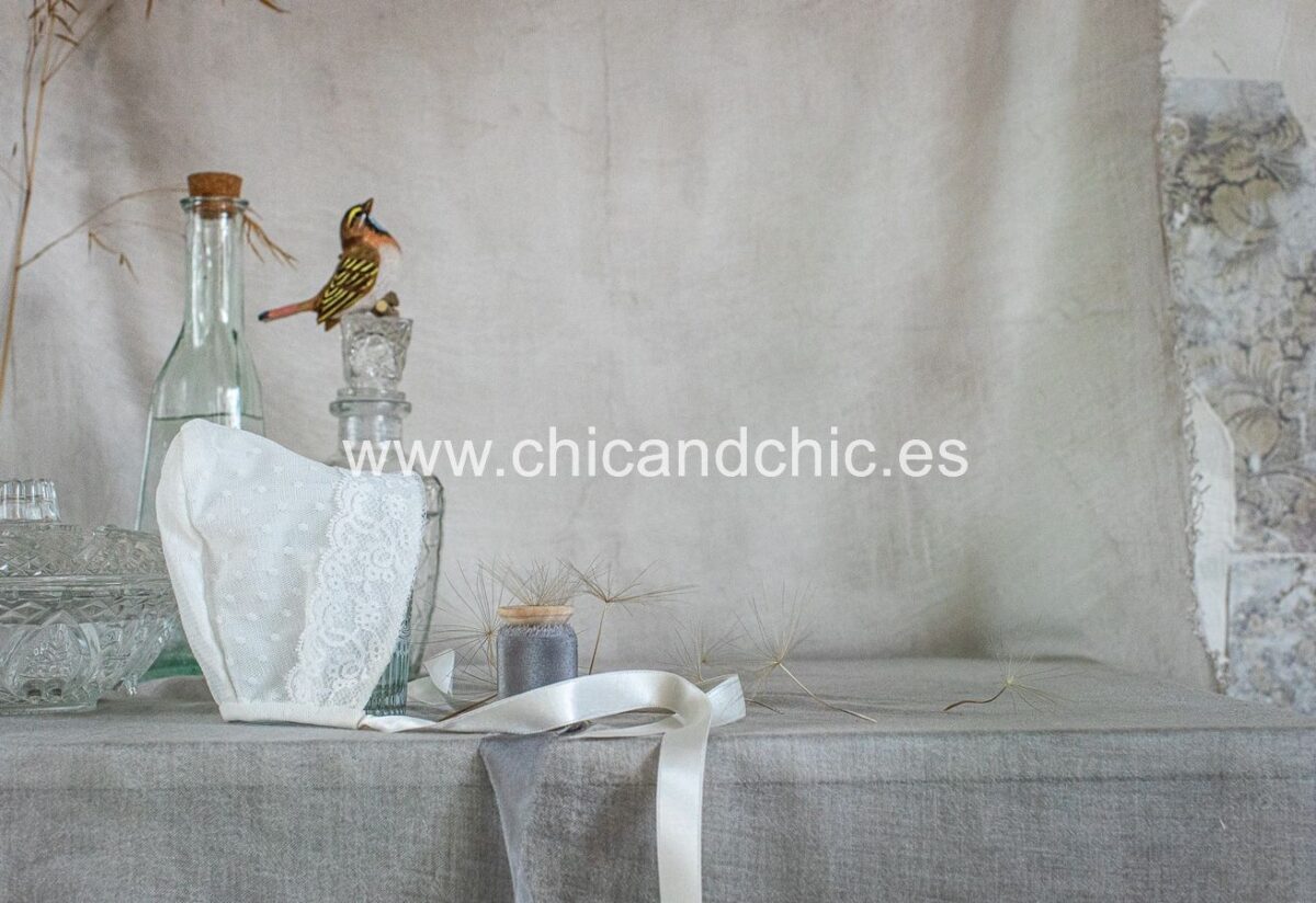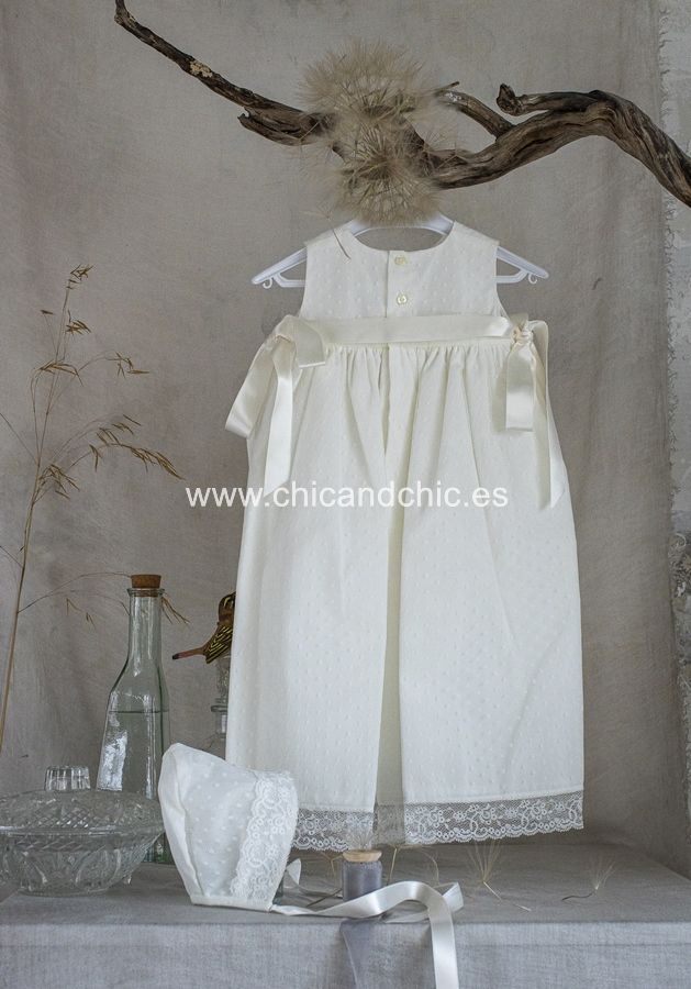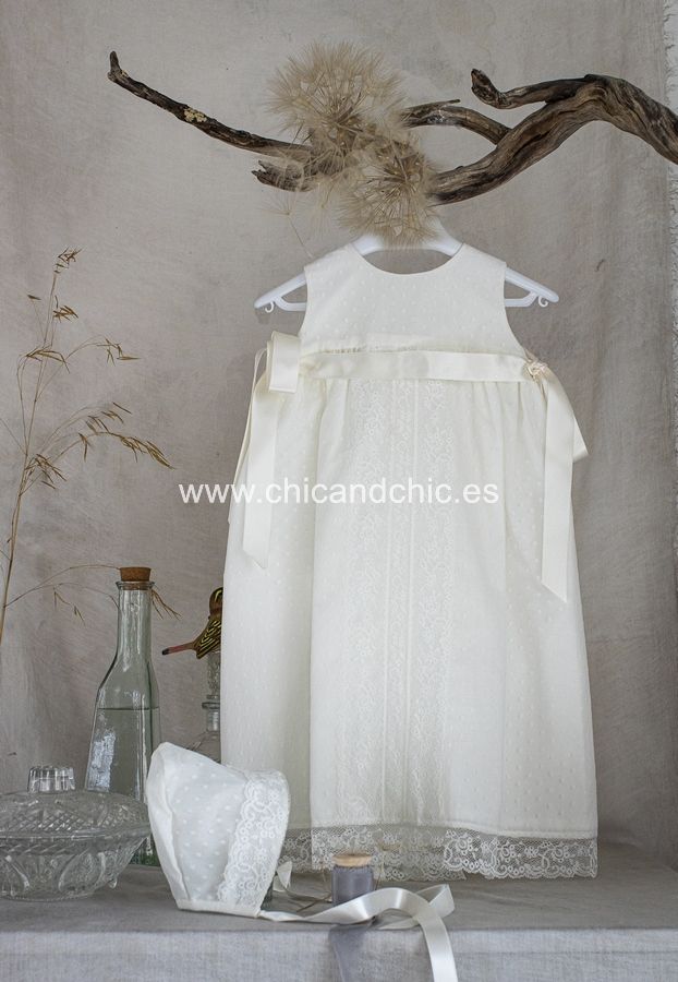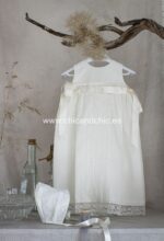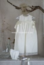 Faldón corto de acristianar en tul plumeti en color beige. Lleva puntilla vertical en todo el faldón, al igual que en la falda . En los laterales llevan dos lazos en raso beige. Viene con forro interior y capota a juego.