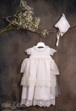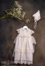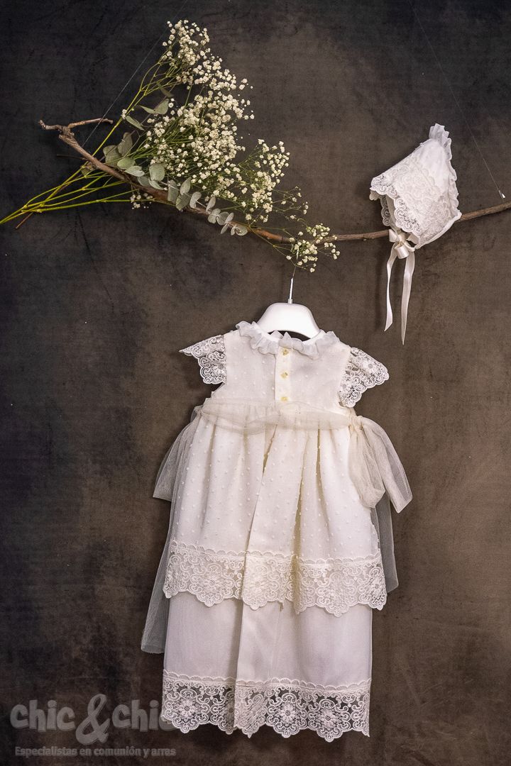 Faldón corto de acristianar en plumeti de organza en color beige. La falda termina con dos capas, donde la primera es de plumeti y llevan los bajos con una espectacular puntilla. En los laterales llevan dos lazos en tul liso del mismo tono marfil a la altura del talle del vestido. Viene con forro interior y capota a juego.