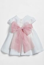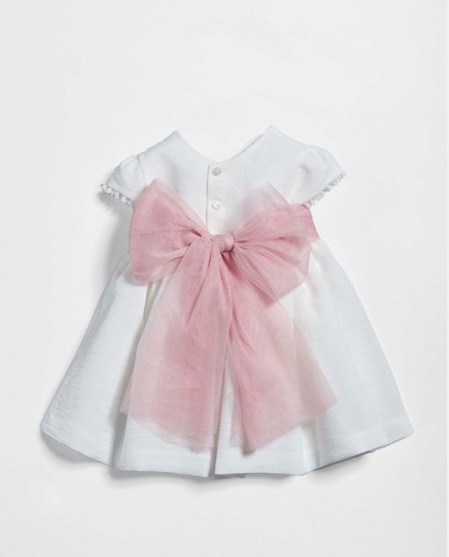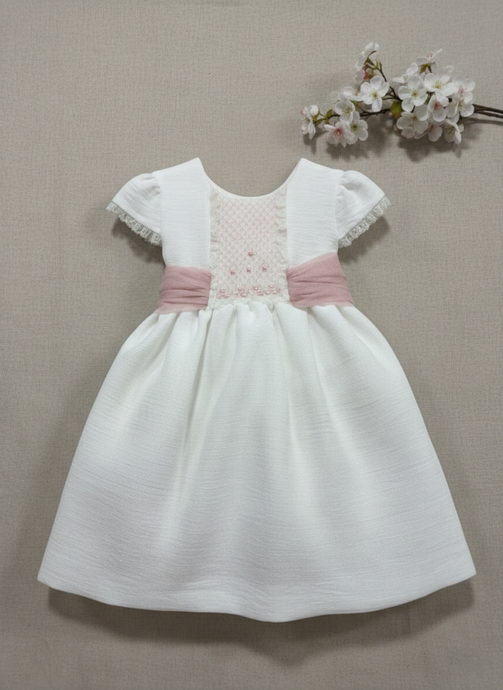 Vestido de ceremonia niña en tul liso blanco roto, con cuerpo bordado rosa