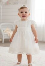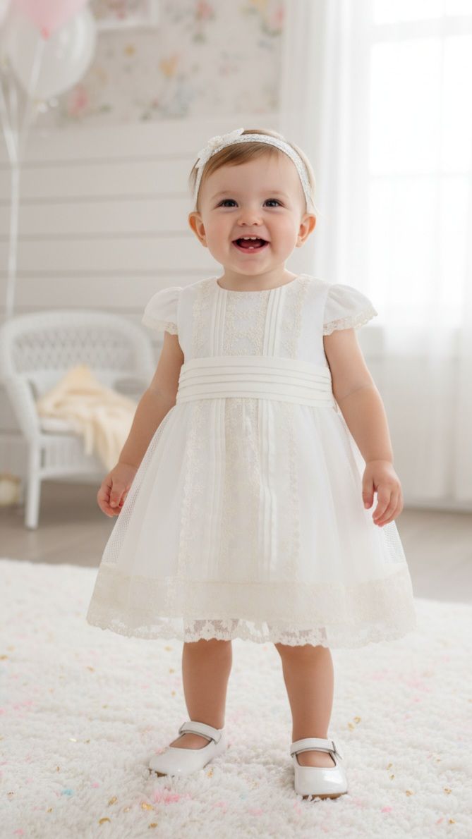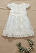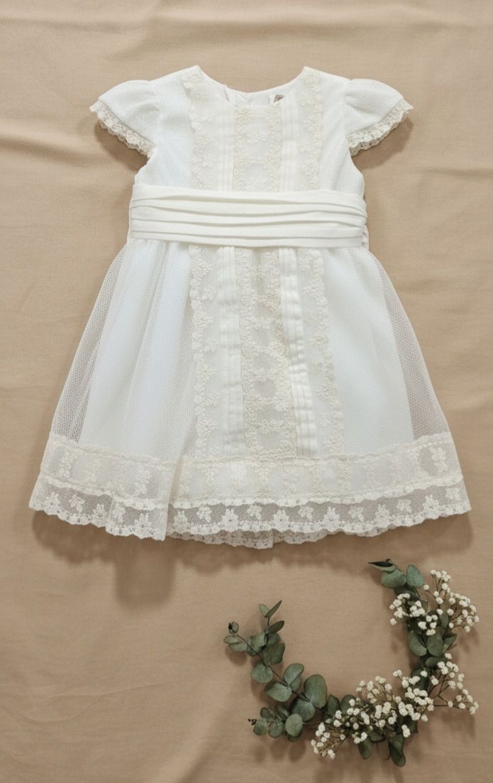 Vestido de ceremonia en tul chipitas. Lleva una preciosa puntilla en beige, vertical, decorado también por unas finas jaretas, y e fajin es de lino beige, con lazada trasera..