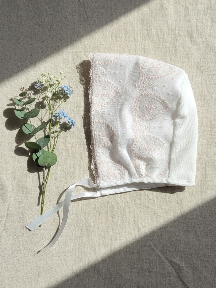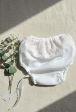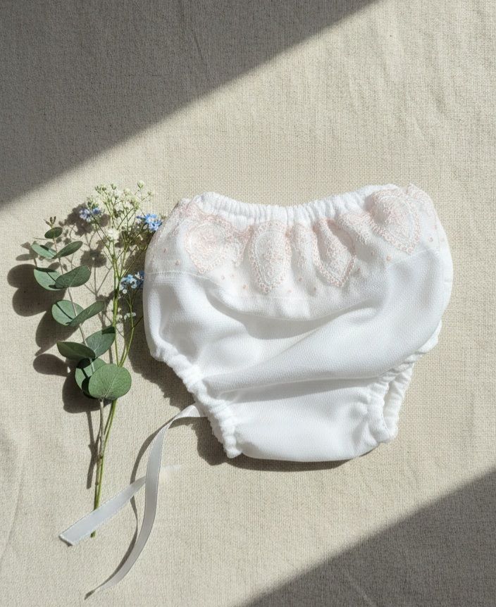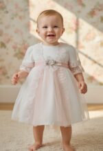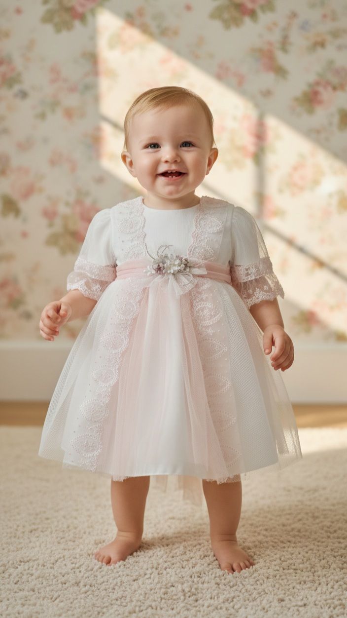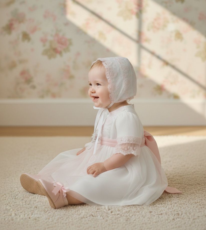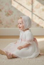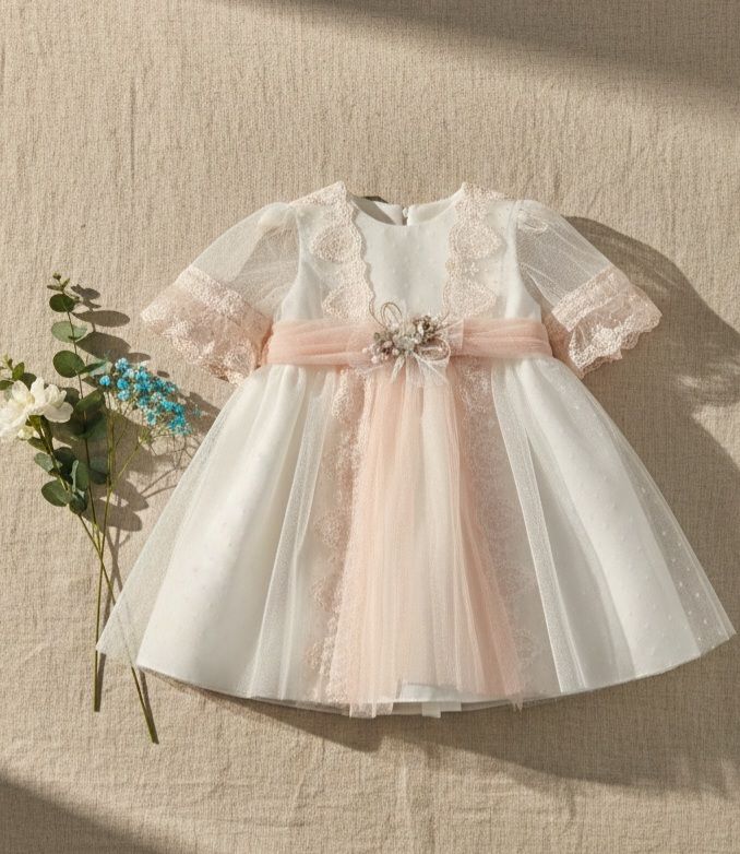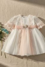 Vestido de ceremonia en tul. De tul liso en blanco roto va decorado por unas bonitas puntillas en tono rosa, desde el cuerpo hacia la falda, con una apertura con un color rosa asalmonado, que da un aspecto muy dulce. Lleva fajín en el mismo tono, con lazada trasera.