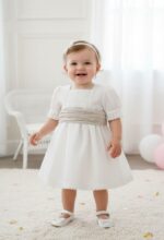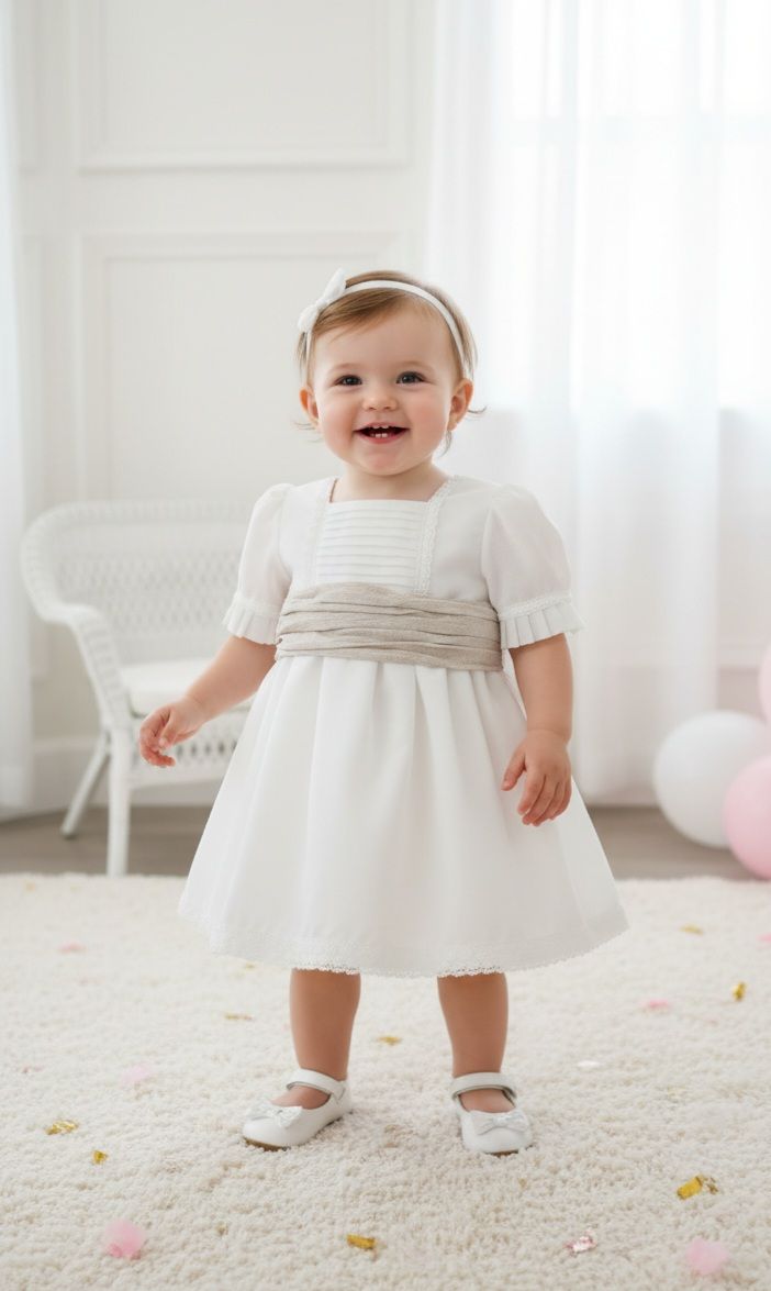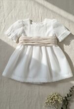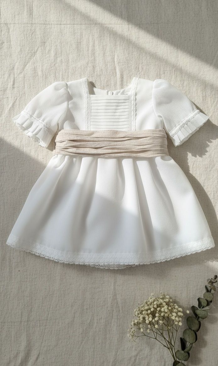 Vestido de ceremonia tipo lino. El cuerpo lleva tablitas, y manga al codo, rematado por bonitas puntillas, igual que en el bajo. Fajín de lino tostado.
