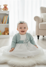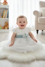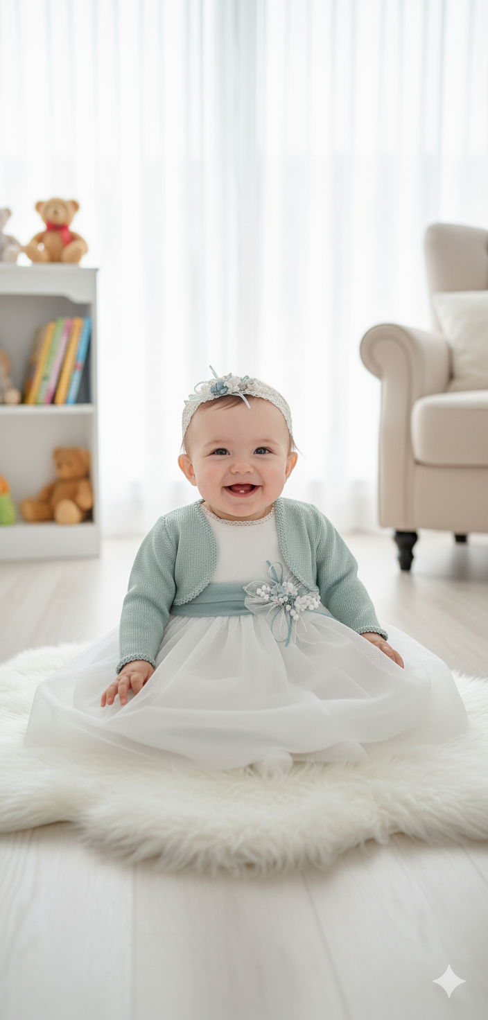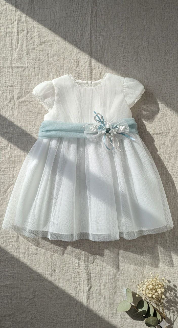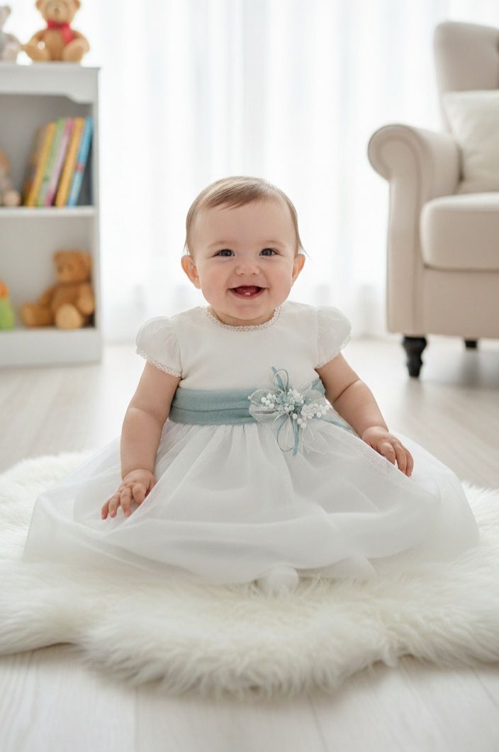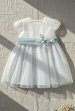 Vestido de ceremonia en tul liso. Cuerpo es en blanco roto y el fajín y falda en un tono verde agua. Lleva manga corta y la espalda cerrada.