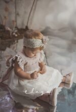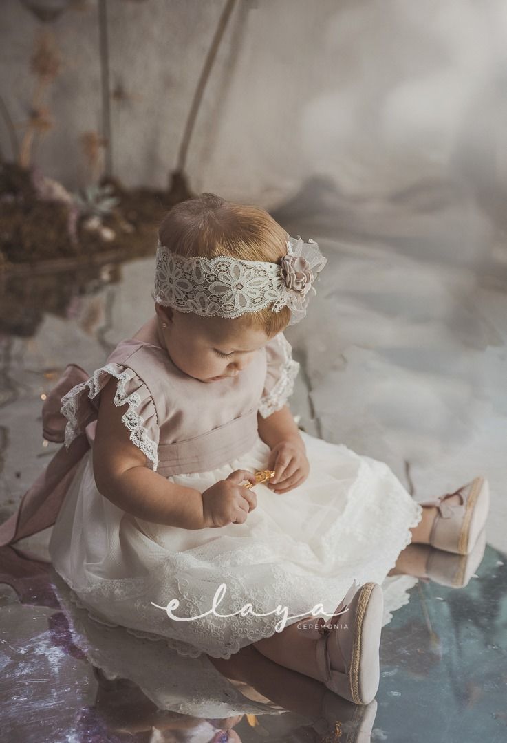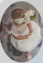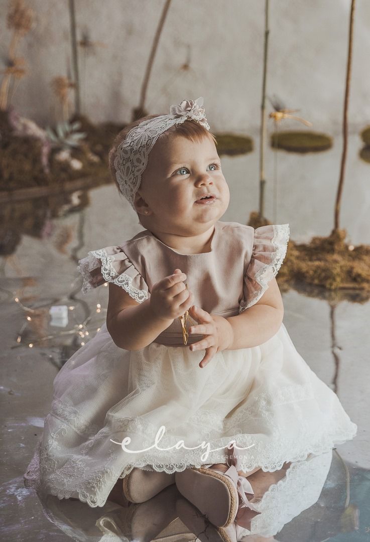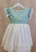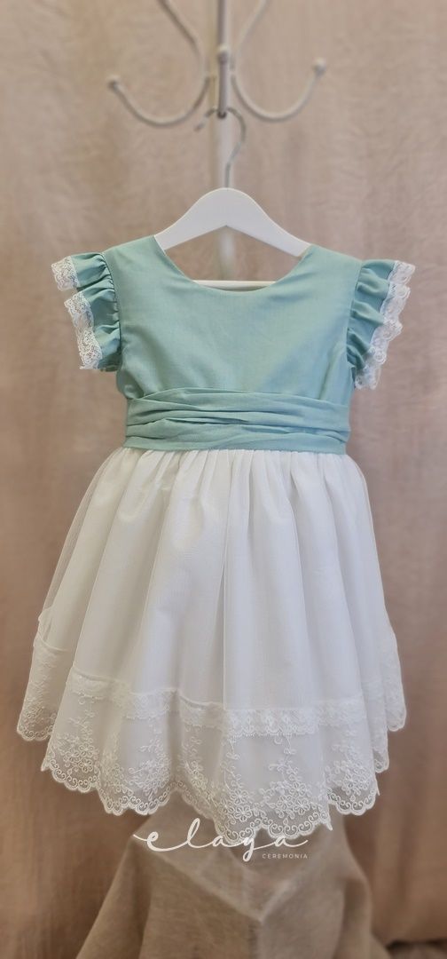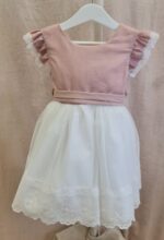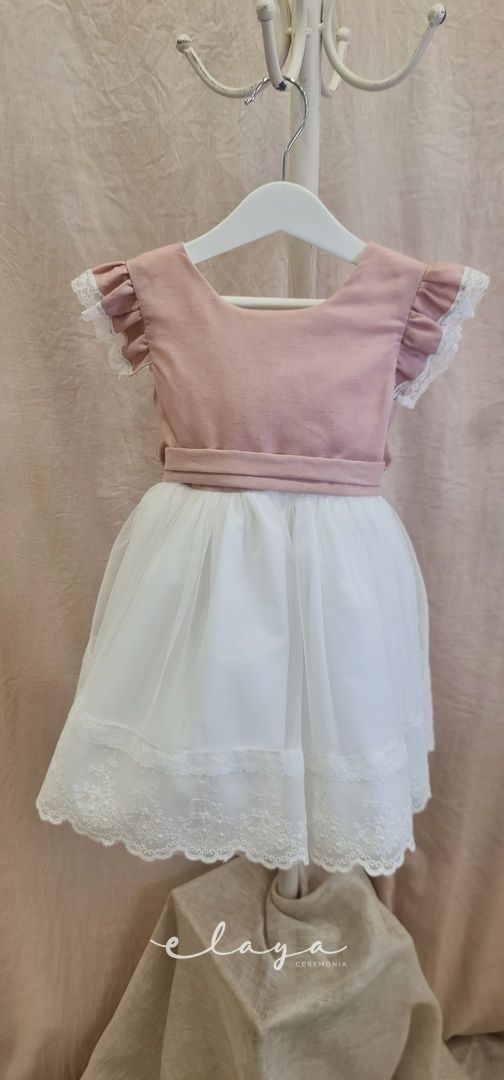 Vestido de ceremonia con el cuerpo en lino de color rosa y la falda de tul decorada por una bonita puntilla. Lleva un pequeño volante en lino con puntilla en el hombro.