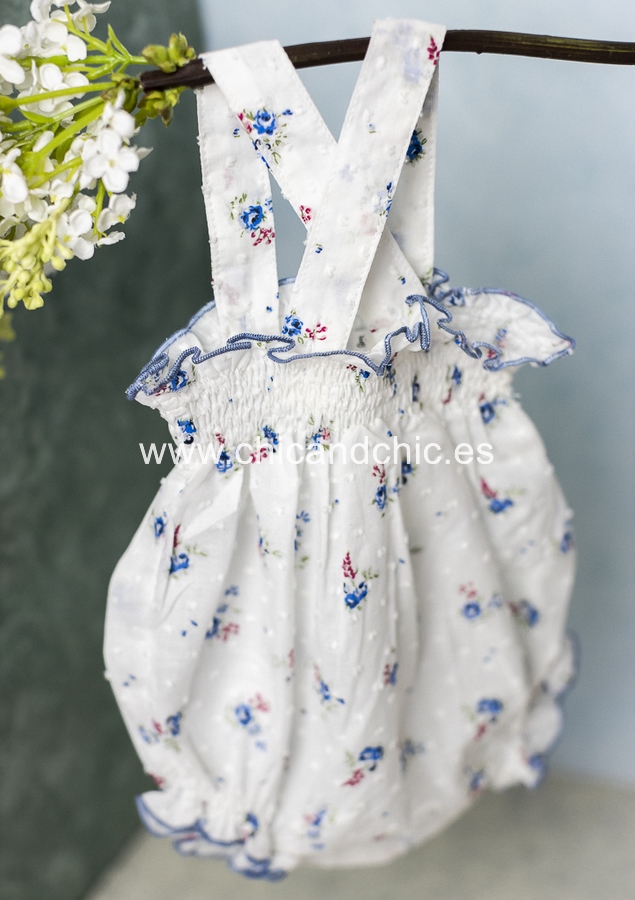 Ranita de tirantes en plumeti de algodón, con tirantes y lacitos estampados en tonos blanco-azulón.