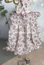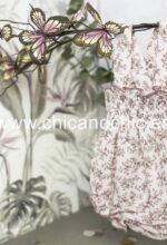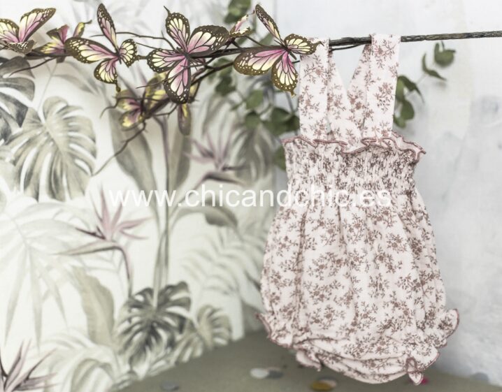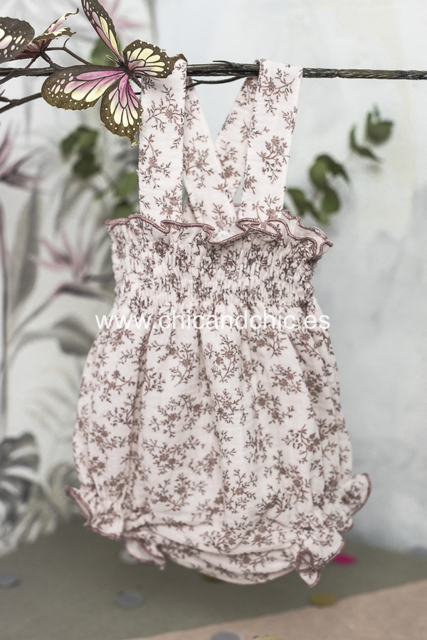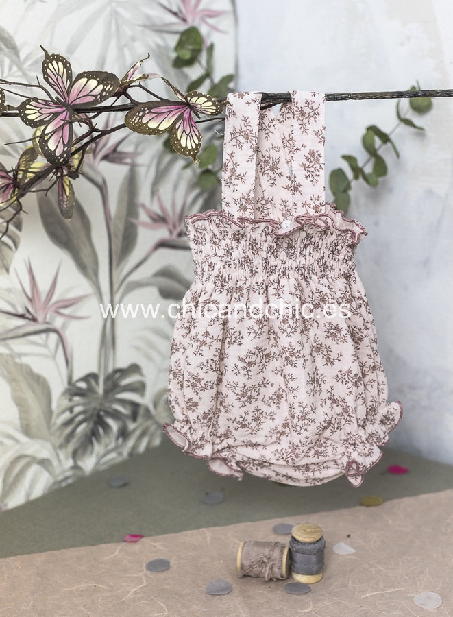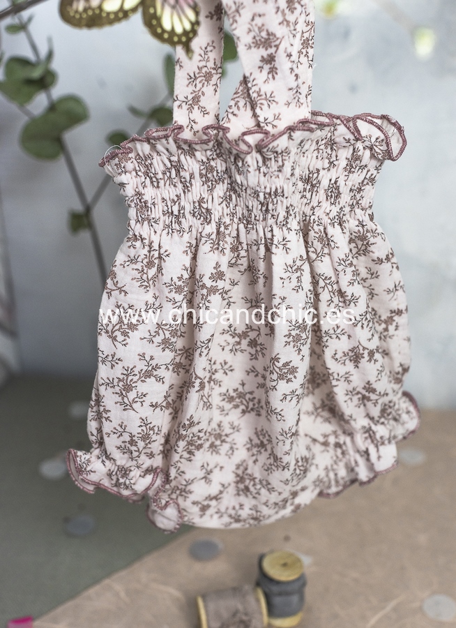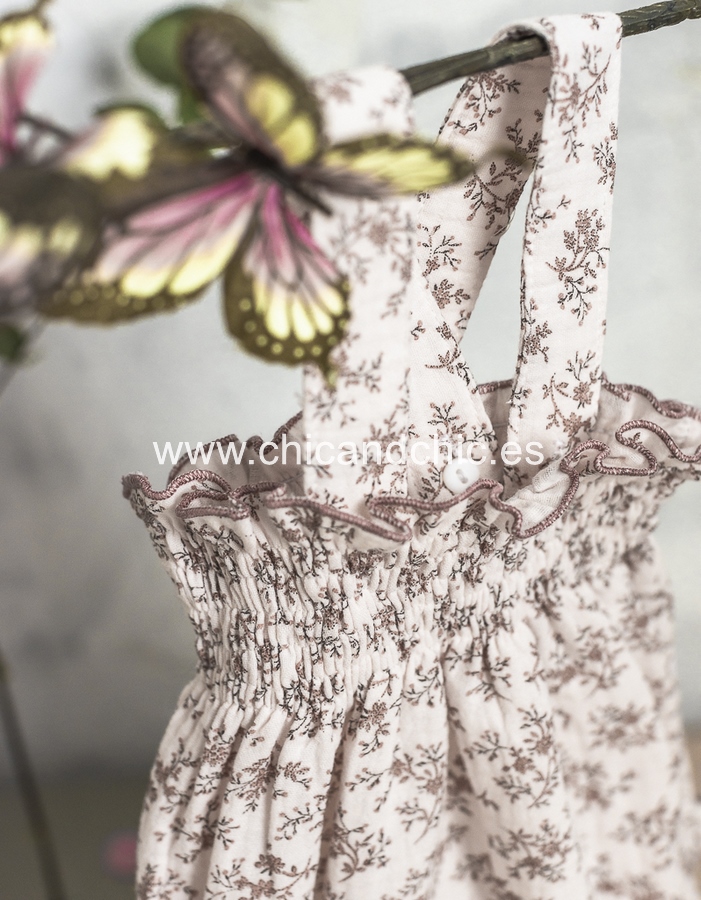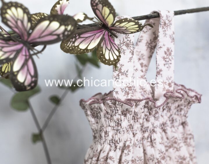 Vestido tipo ranita, con tirantes en tejido de algodón suave. Tonos rosas.