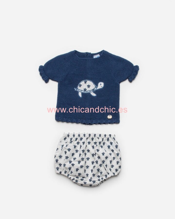 Conjunto de bebe con jersey en manga corta de punto y cubrepañal en tela con estampado de tortugas.