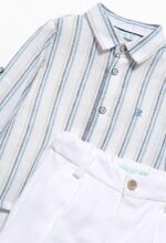 Conjunto niño con camisa azul de rayas y pantalon blanco.