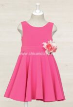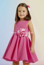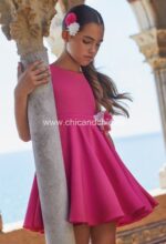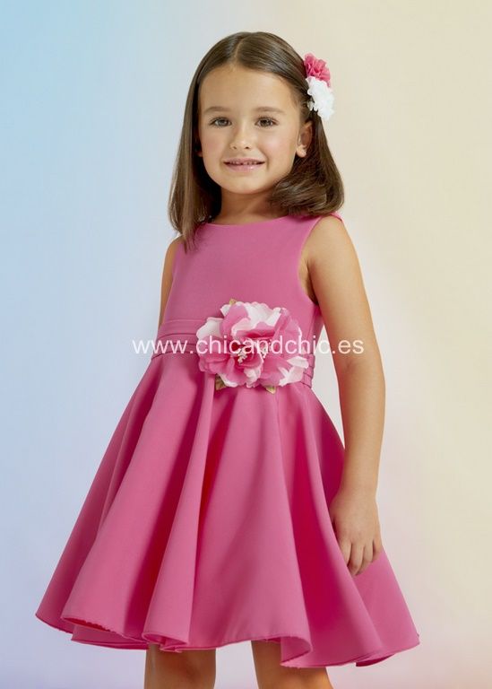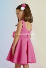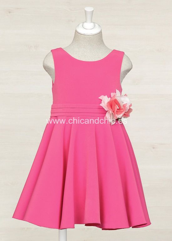 Vestido de ceremonia en crep liso color fresa. Lleva incluida una flor en el fajín.