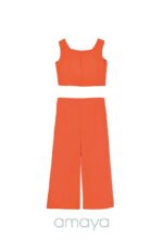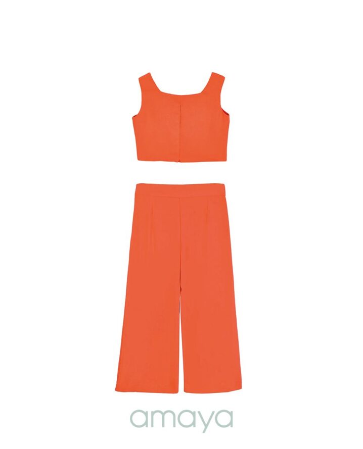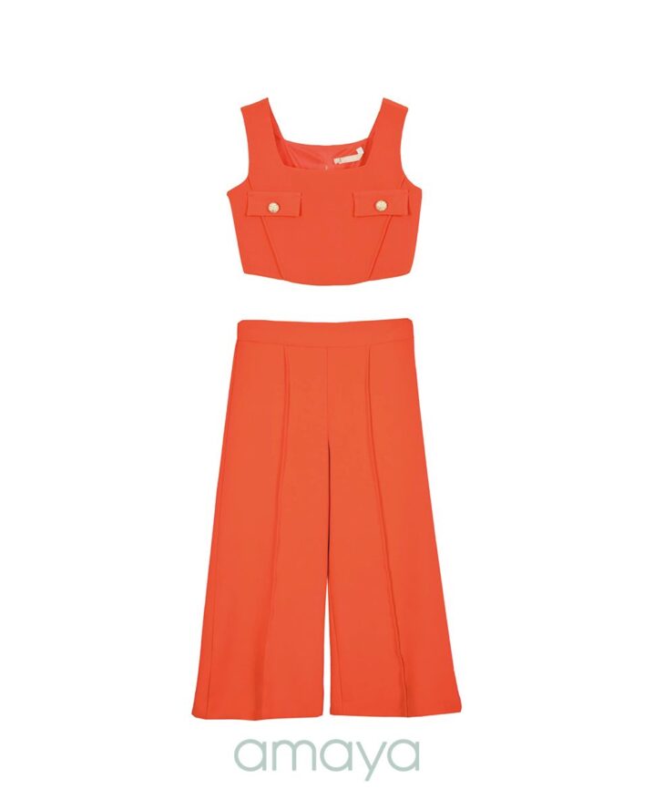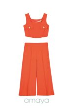 Conjunto pantalón en crep fino con camisa adornada por botones dorados, y pantalón a juego en color coral.