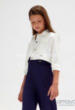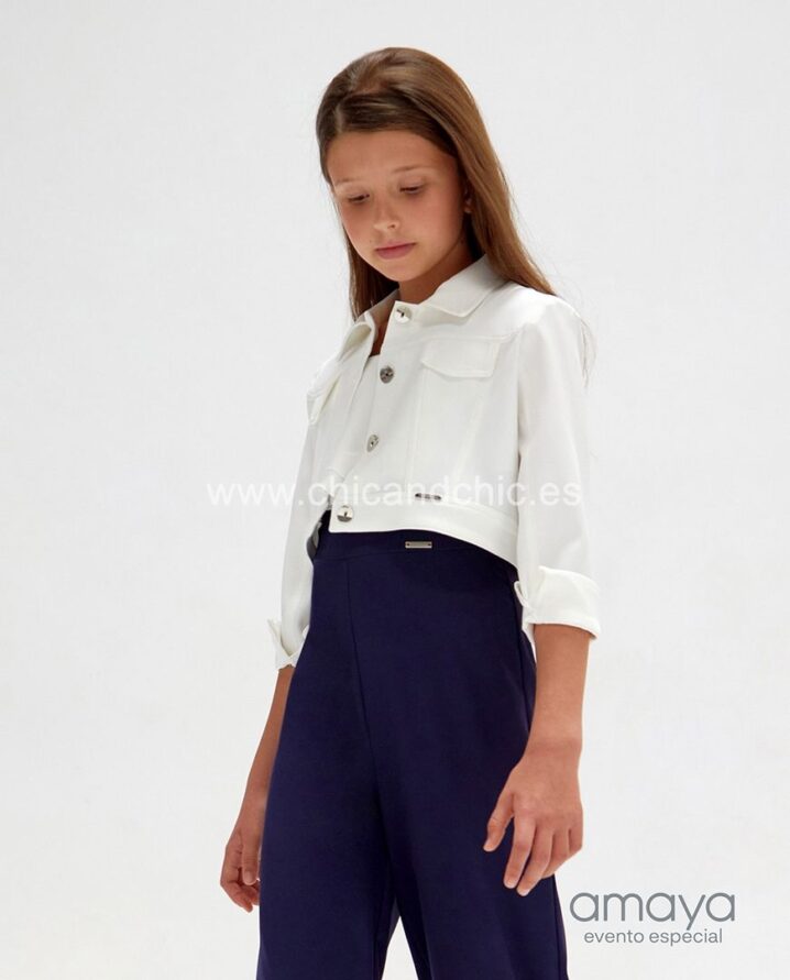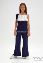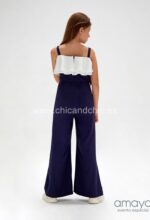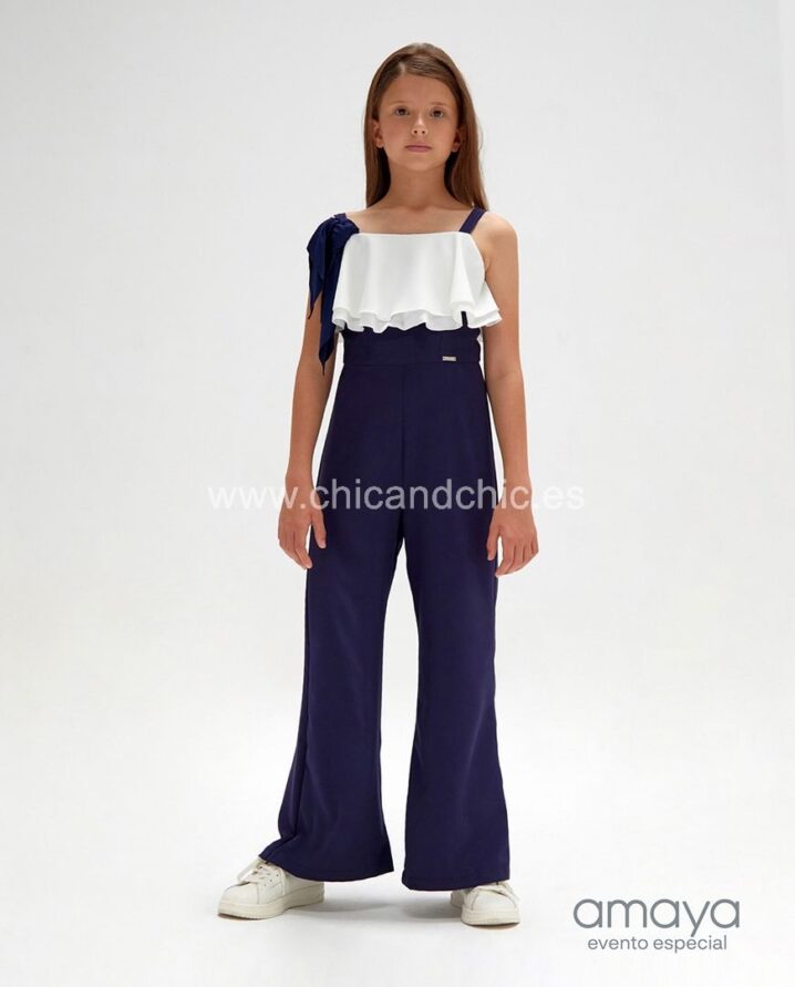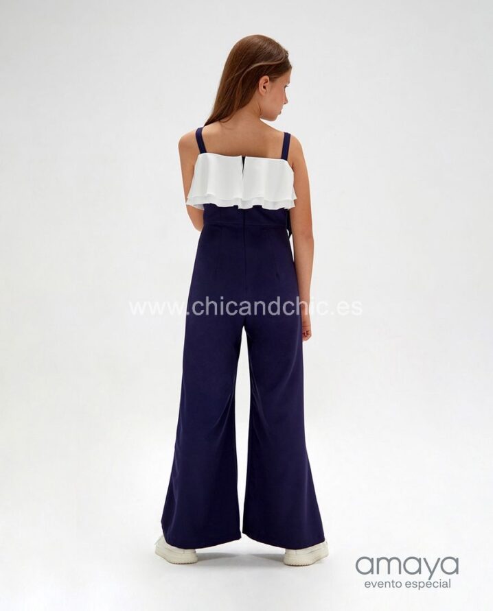 Mono bicolor en crep color marino, con volante en el cuerpo blanco roto.
