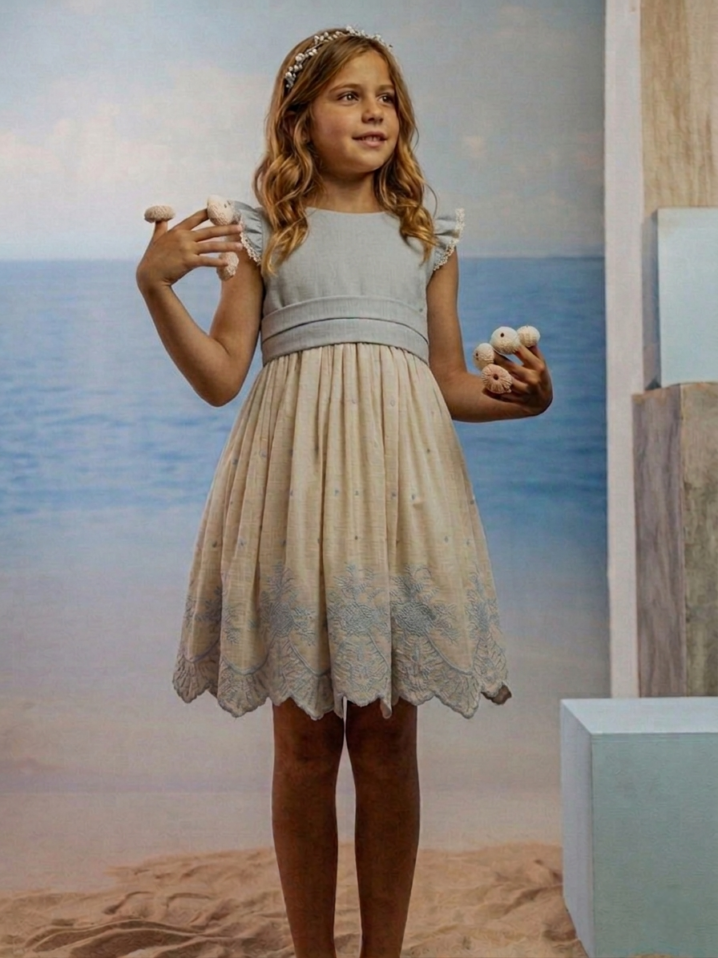 Vestido de ceremonia en lino beige.. Lleva el cuerpo en tono azul océano, con mangas tipo volante, y la falda en tono beige con un bordado en azul. Fajín en azul, terminada en lazada trasera, y escote a pico.