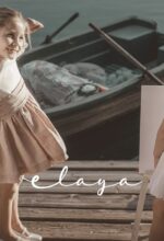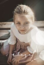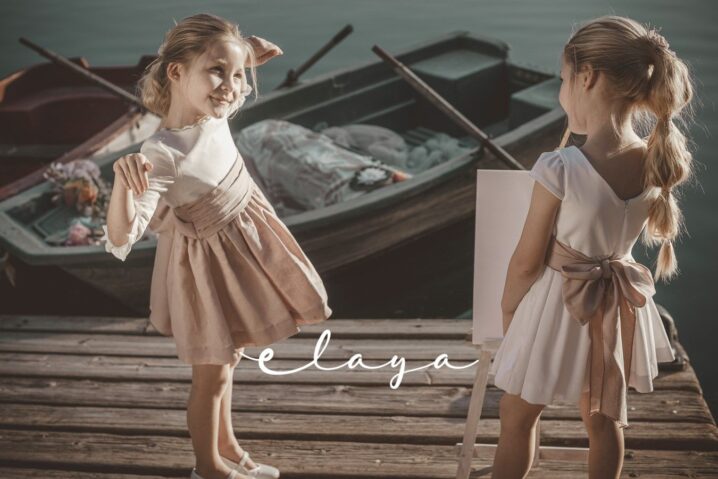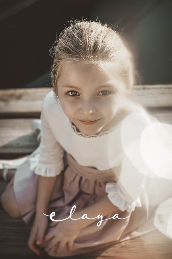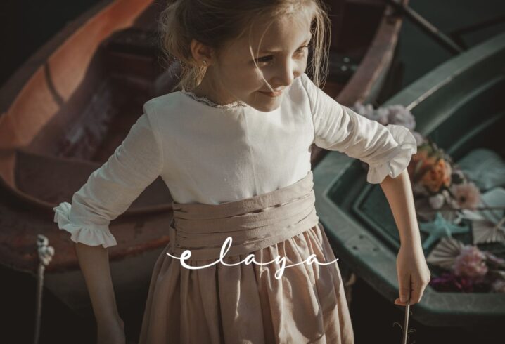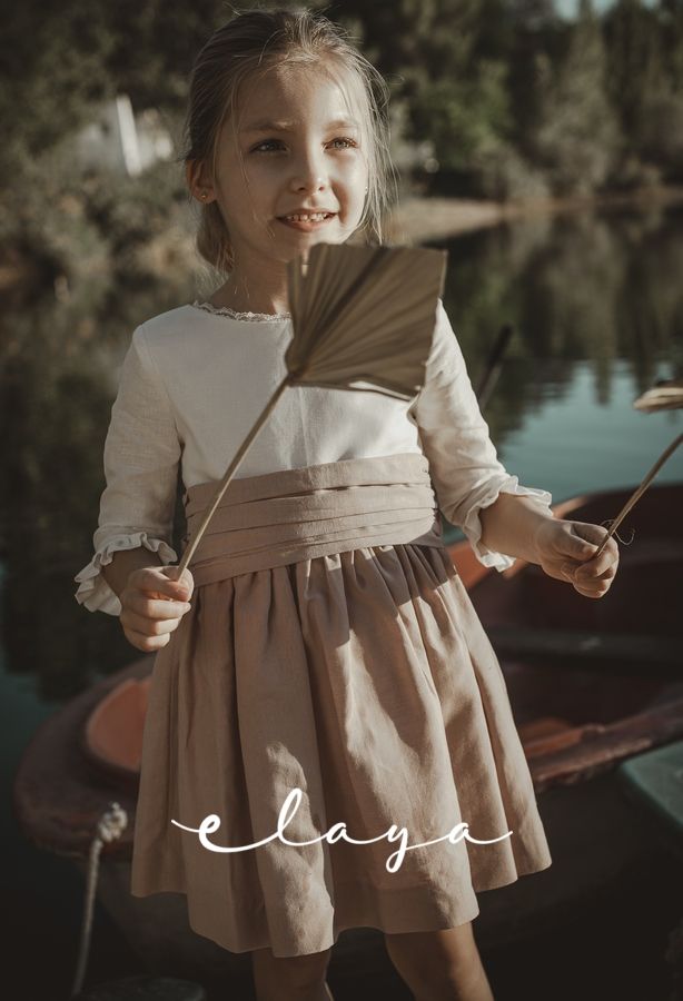 Vestido de ceremonia en lino blanco roto-rosa. Es de corte a la cintura con manga francesa. El cuerpo, de color blanco roto, u la falda y fajín es rosa maquillaje. La espalda lleva escote a pico redondeado.