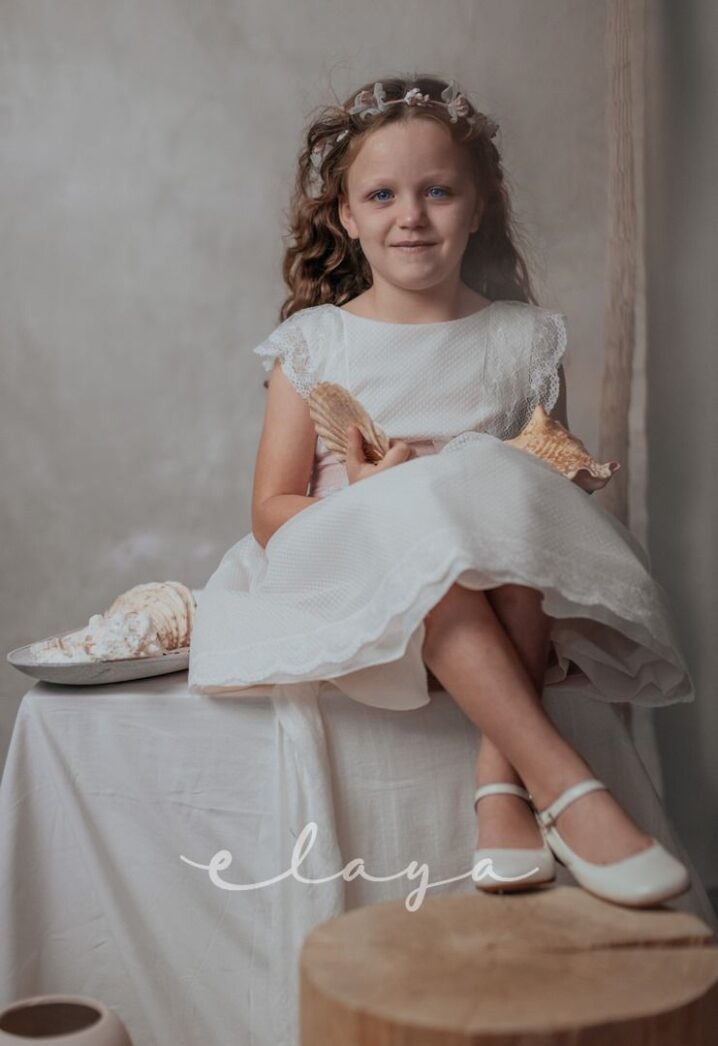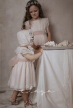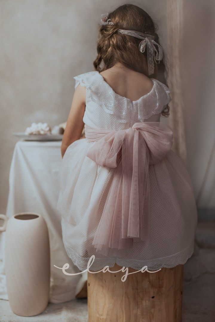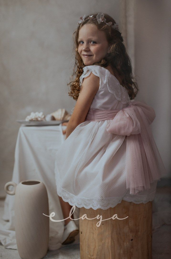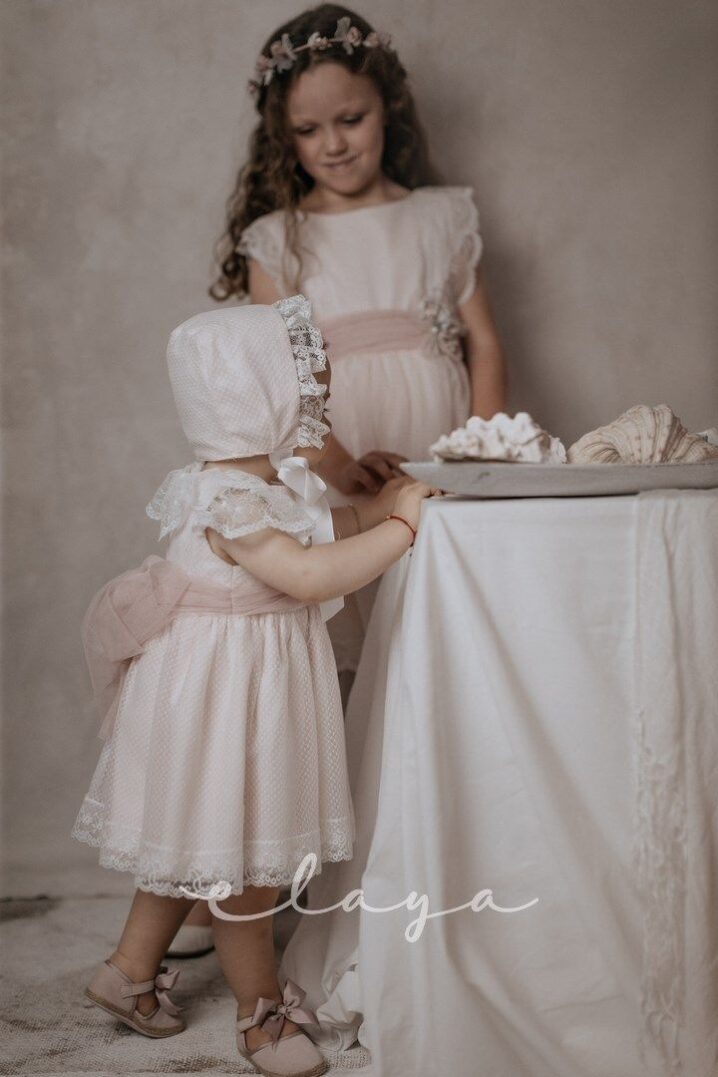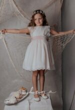 Vestido de ceremonia en tul de redecilla. Lleva una bonita puntilla en el cuerpo y mangas, así como en la falda. Color rosa claro.La espalda lleva escote a pico redondeado.