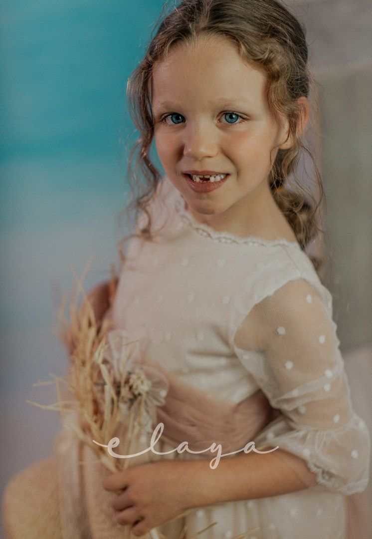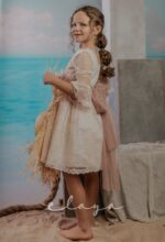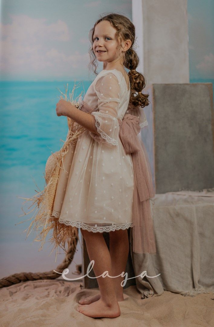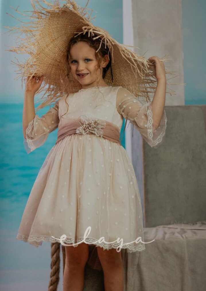 Vestido de ceremonia de manga francesa en tul topos beige con fajín en rosa maquillaje.
