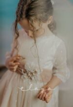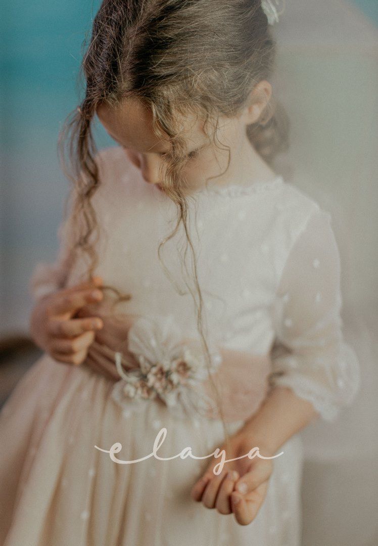 Vestido de ceremonia de manga francesa en tul bordado de topos beige