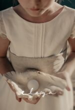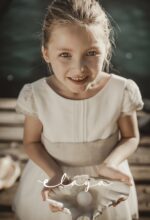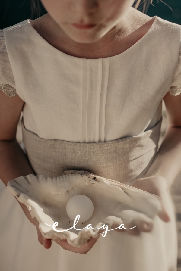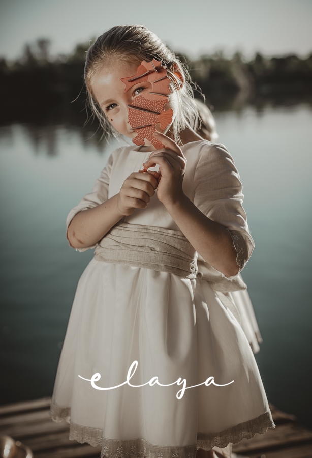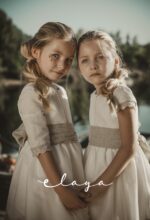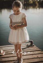 Vestido de ceremonia en tul blanco roto y fajín tostado. Es de corte a la cintura de manga corta. Todo de color blanco roto, con unas bonitas puntillas en tostado en la manga y terminación de la falda. El fajín es de lino en tostado. La espalda lleva escote a pico redondeado.
