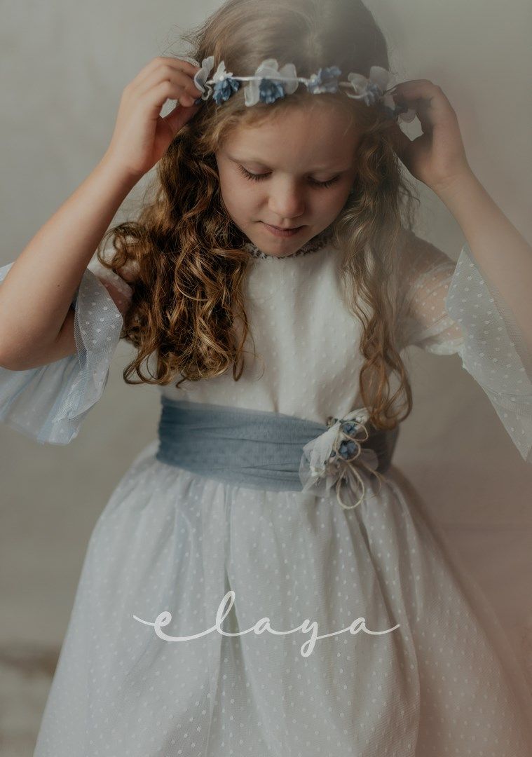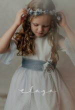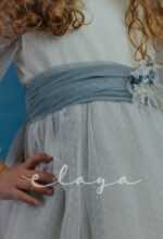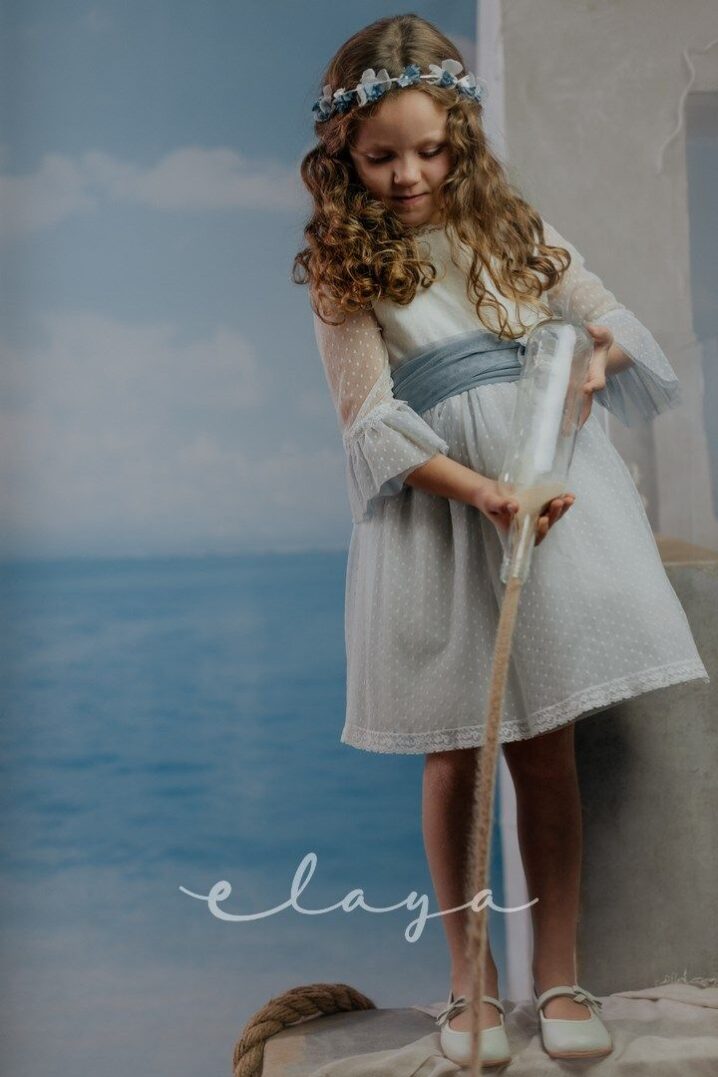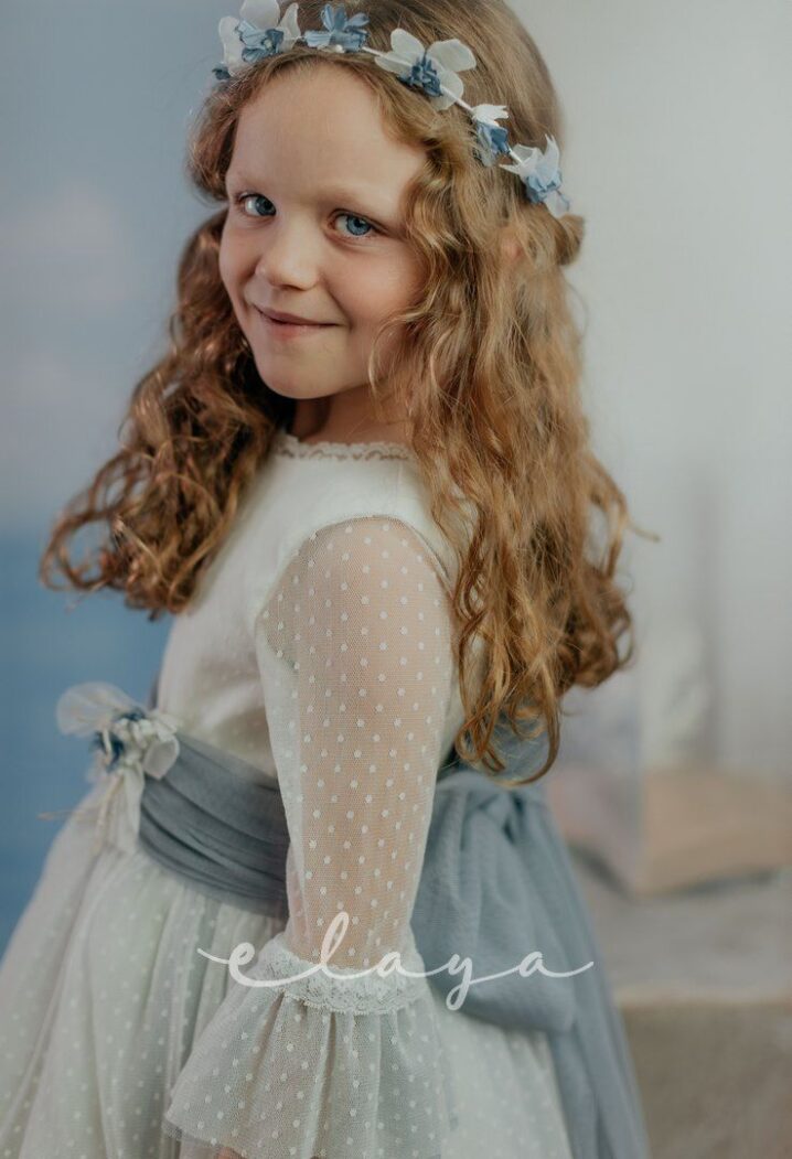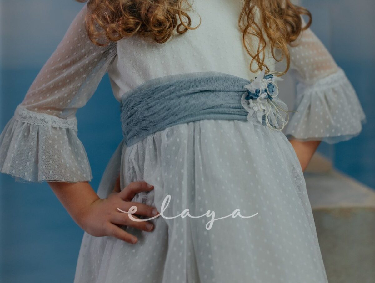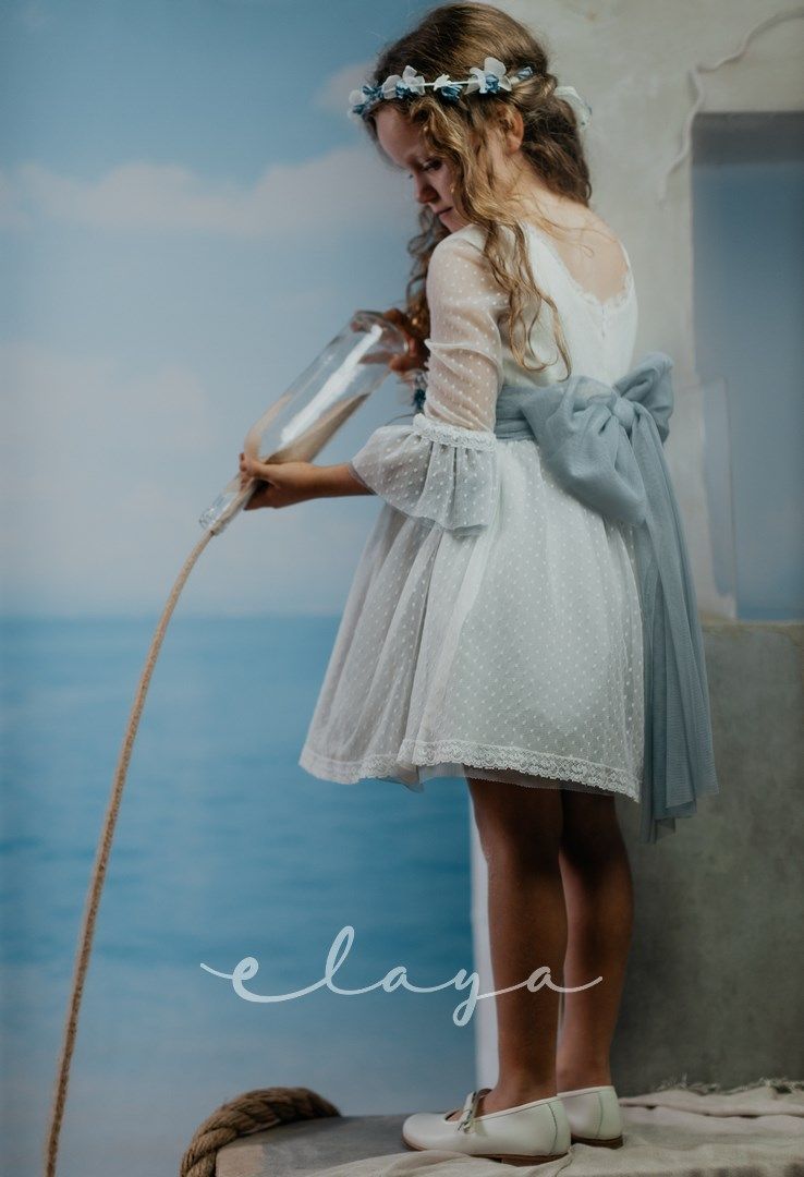 Vestido de ceremonia. en tul de topos. Lleva manga francesa acabada en volante, con el cuerpo blanco roto y la falda en color azul océano. La espalda lleva escote a pico redondeado.