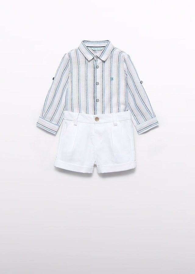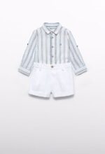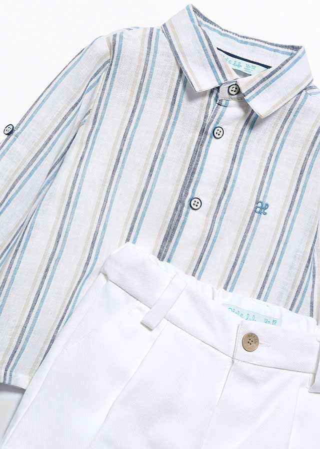 Conjunto niño con camisa azul de rayas y pantalon blanco.