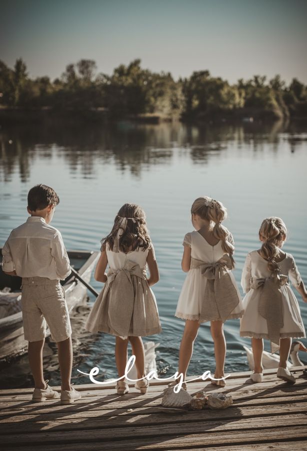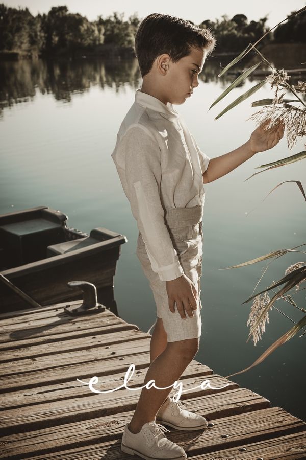 Conjunto de lino niño. Camisa de cuello mao en lino crudo y pantalón y fajín de jaretas de lino tostado.