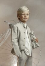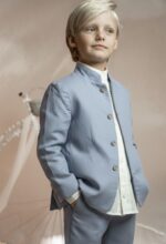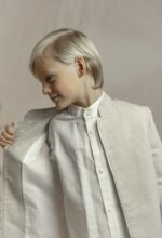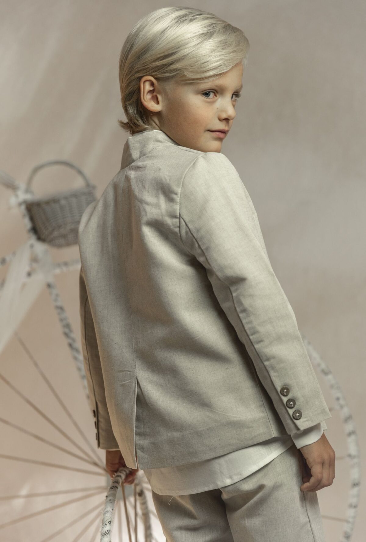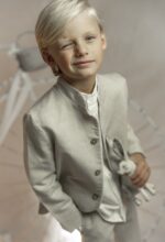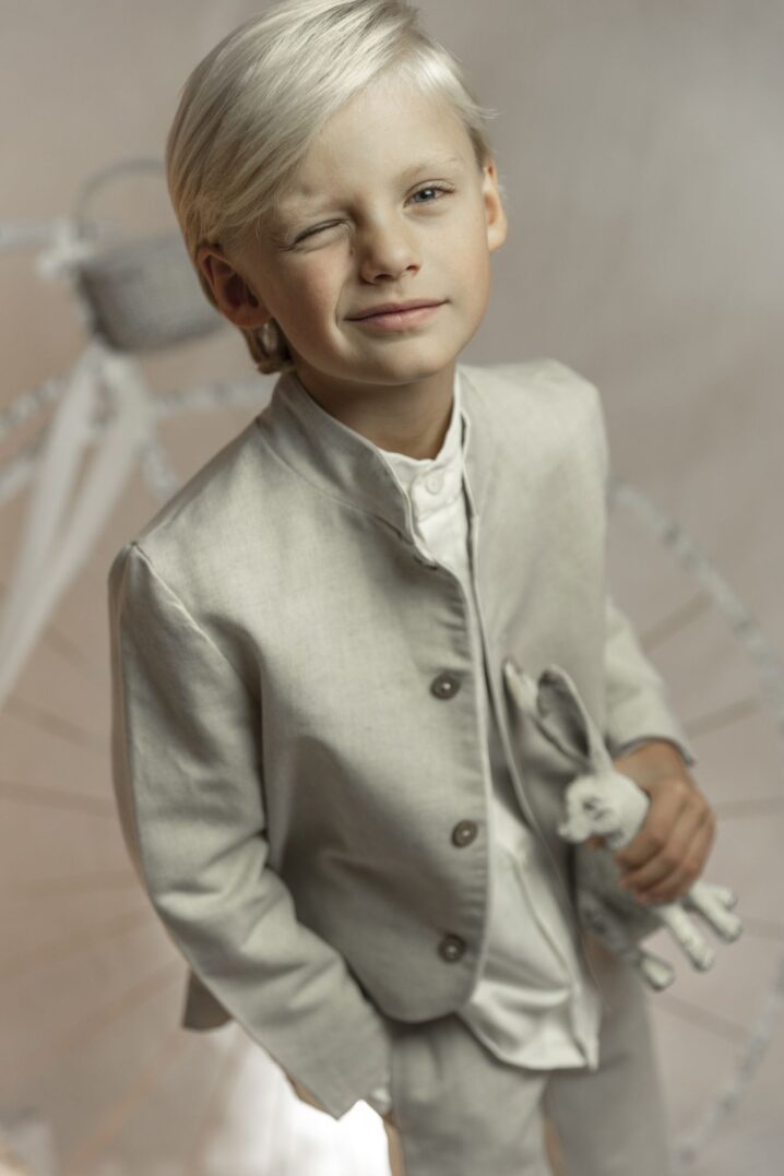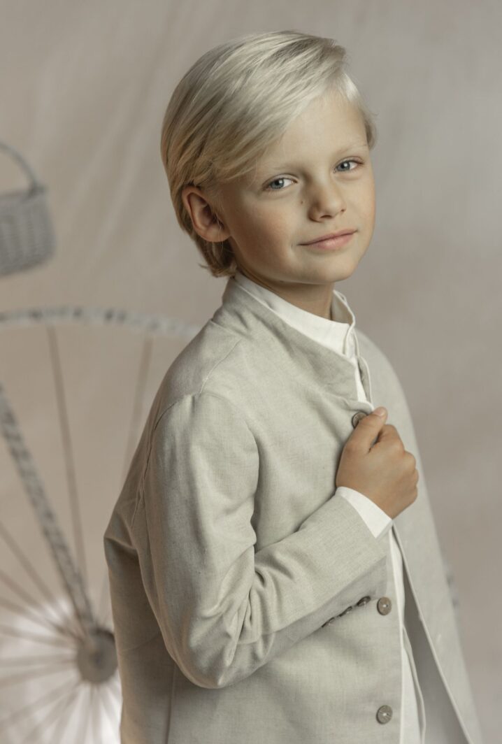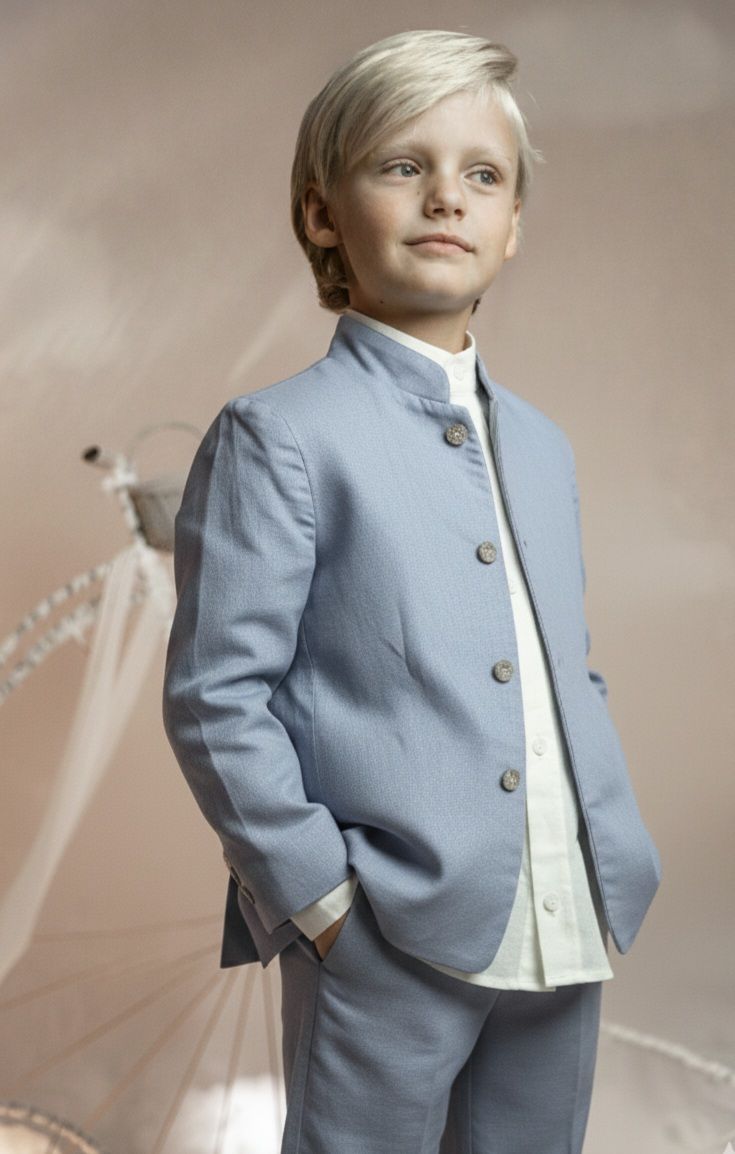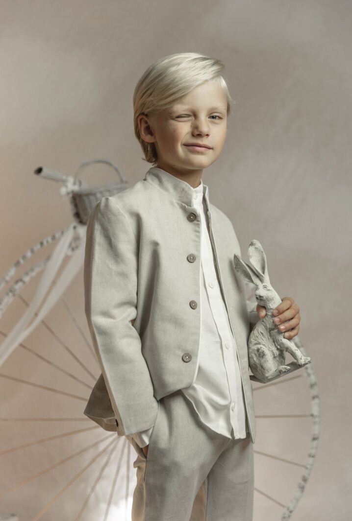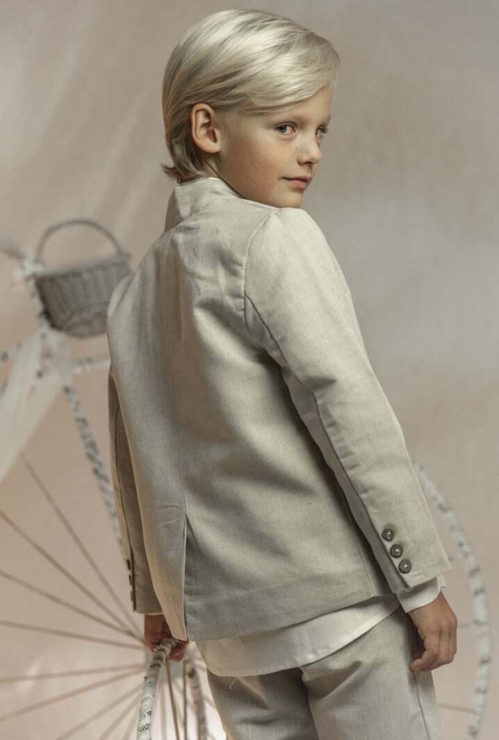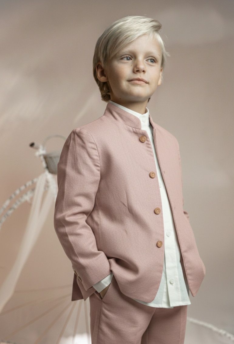 Conjunto de lino niño. Camisa de cuello mao en lino crudo, pantalón largo.