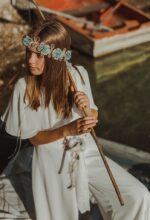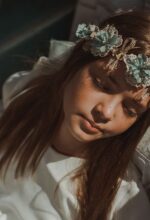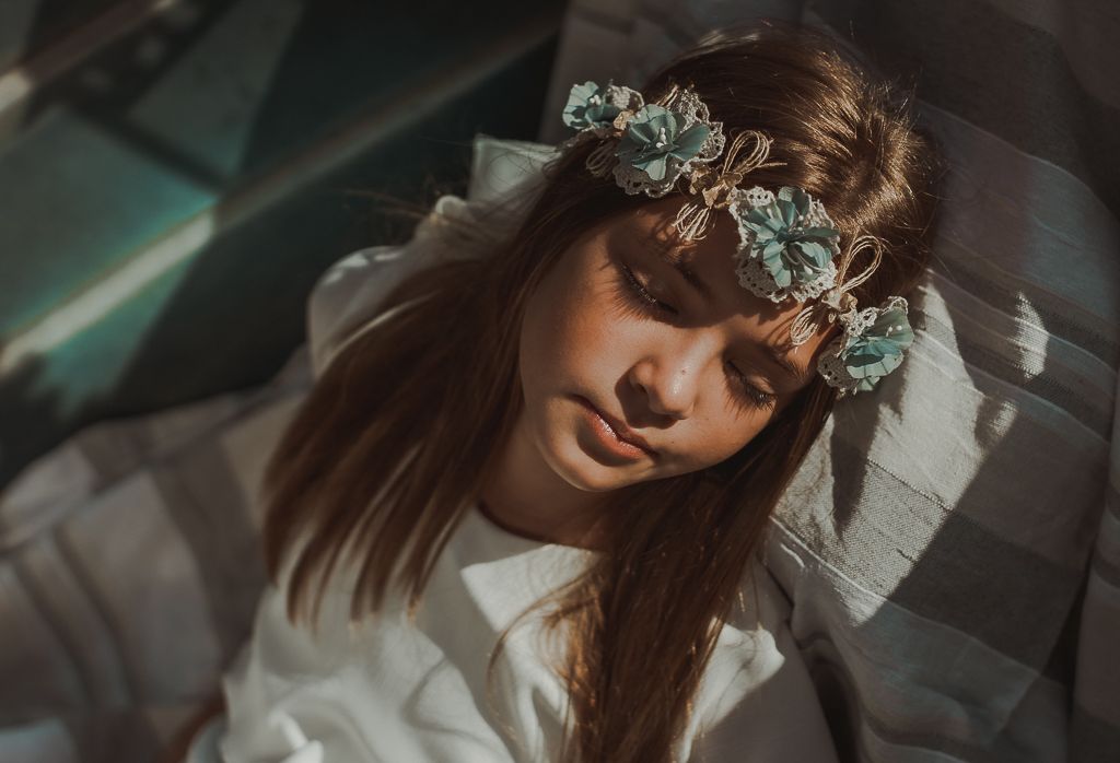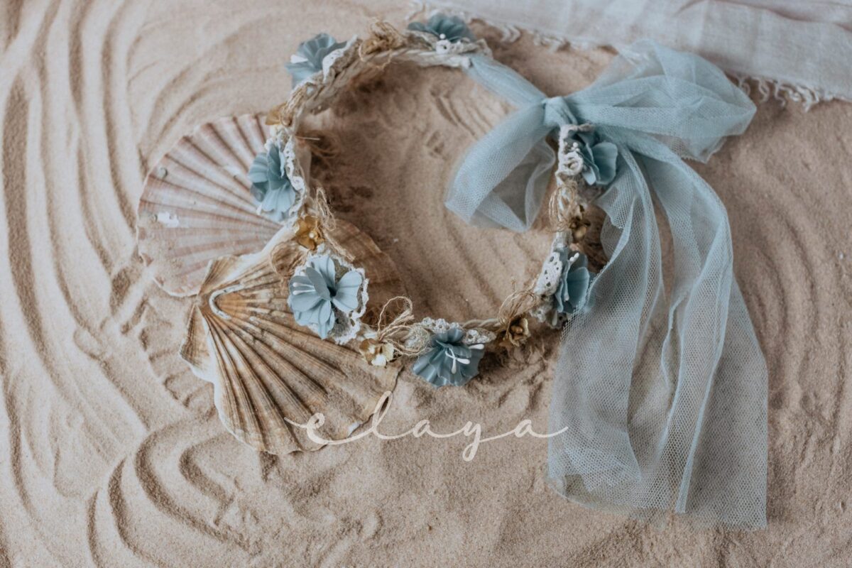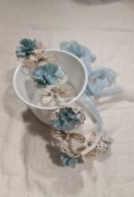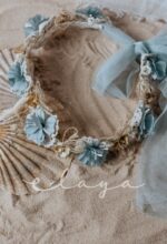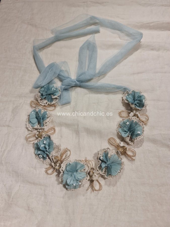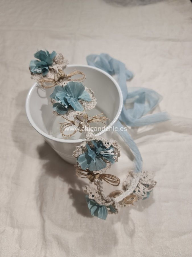 Preciosa corona con tira de organza para atar detrás.