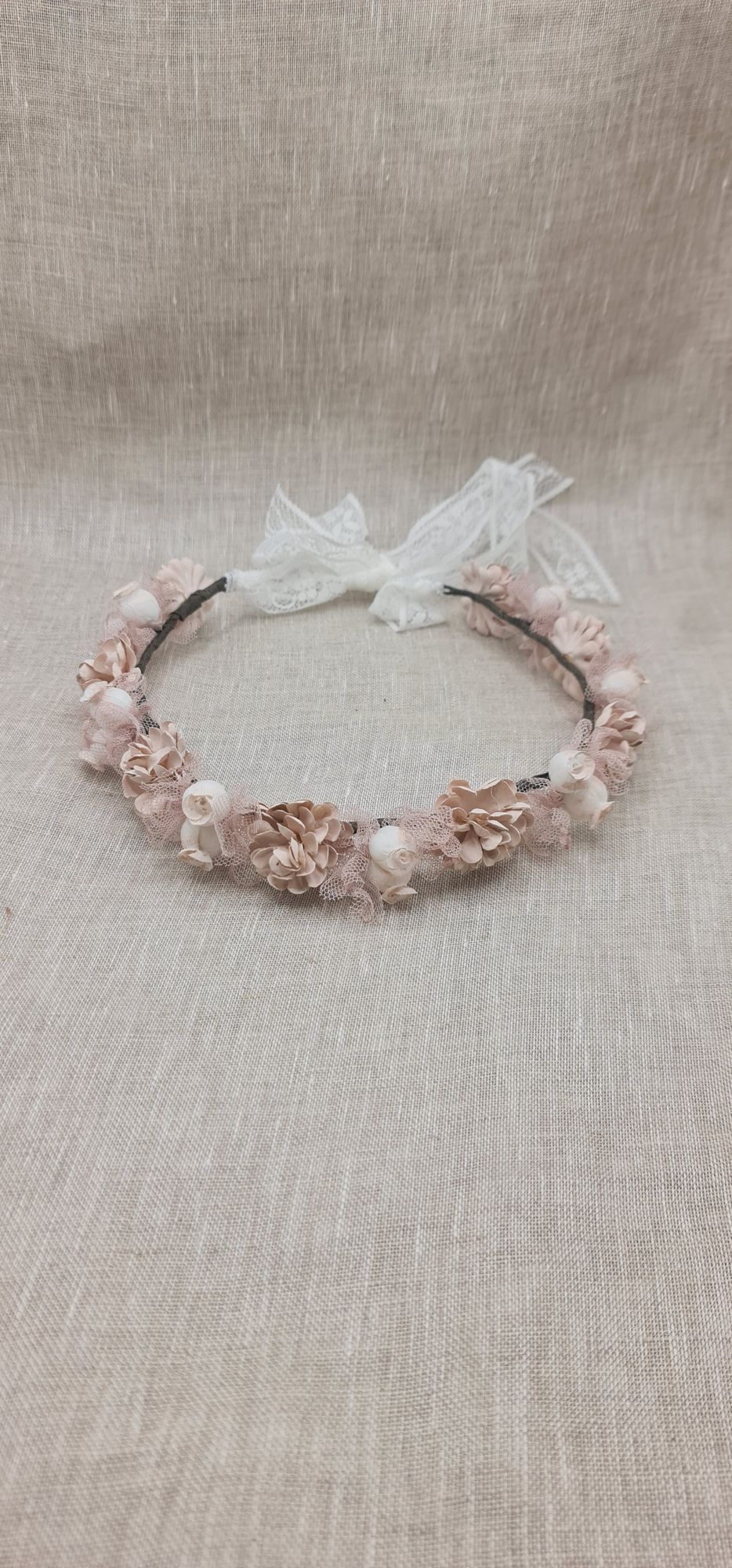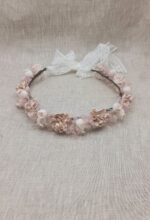 Corona de flores con cinta de atar en blanco roto. Tonos ROSAS