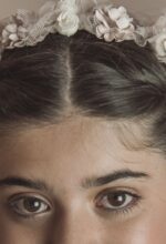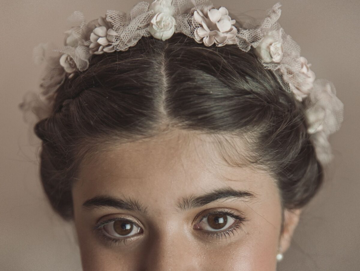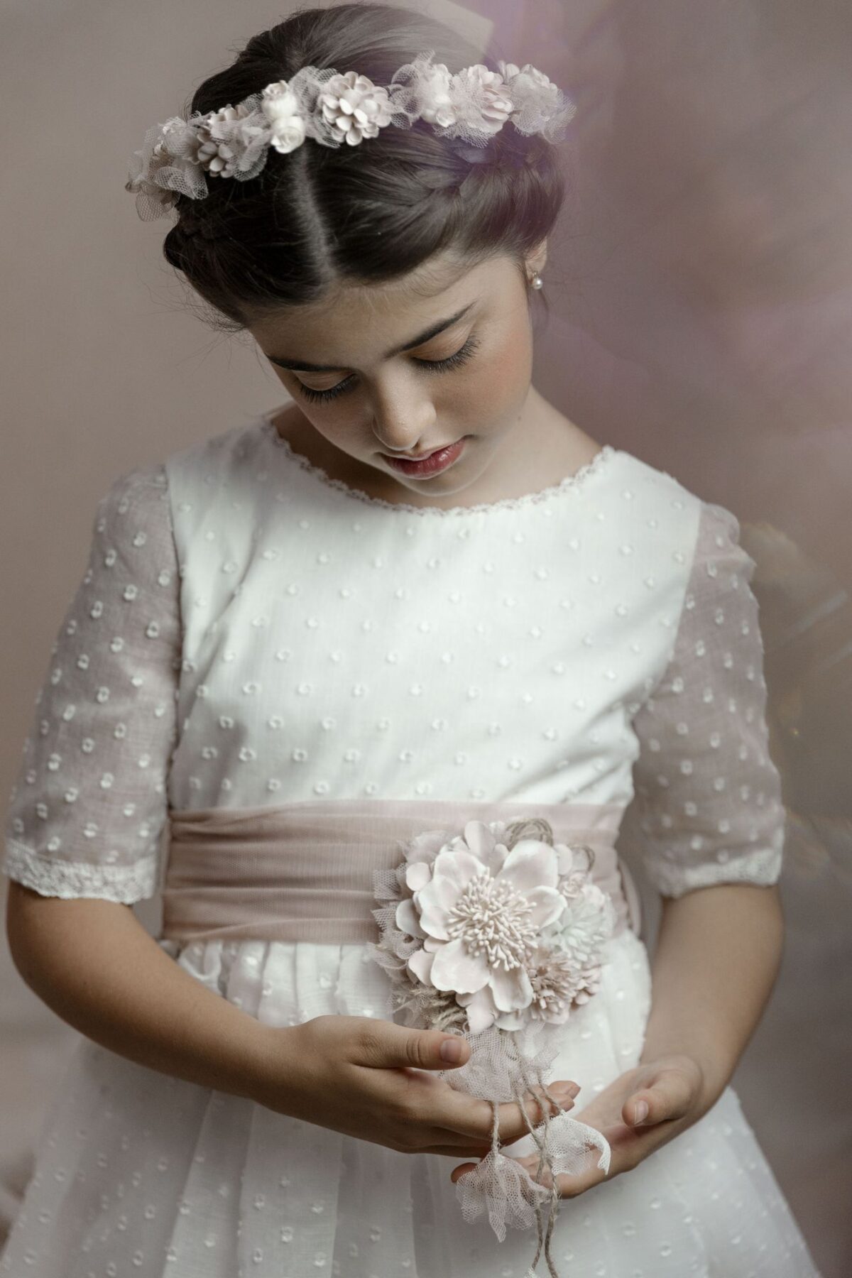 Corona de flores con cinta de atar en blanco roto. Tonos rosas