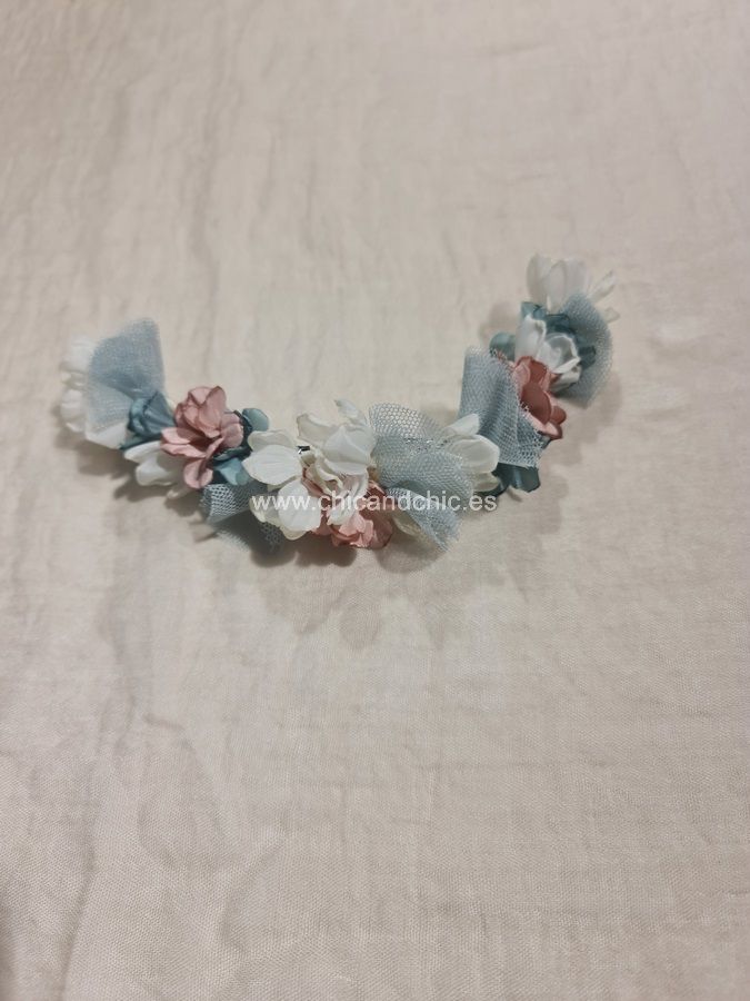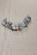 Media corona flores del tamaño del vestido olimpia. Mide 20 cm, pero se puede amoldar a moño.
